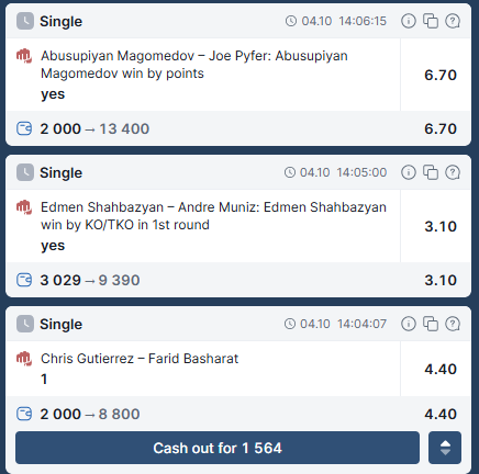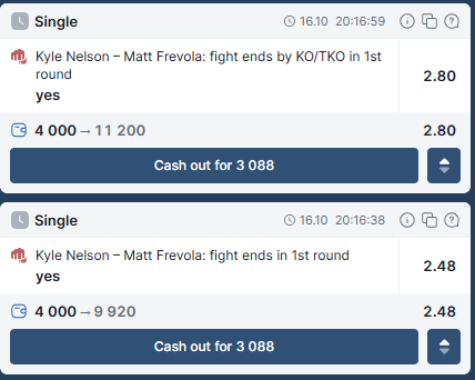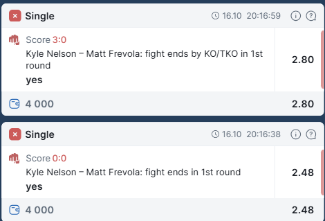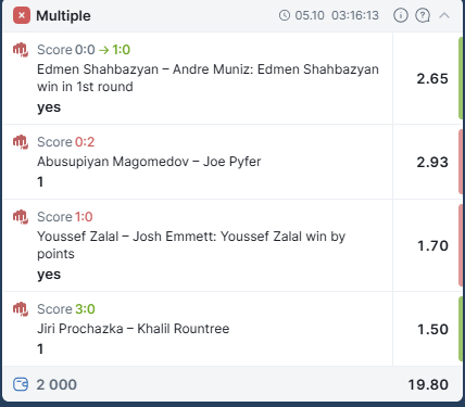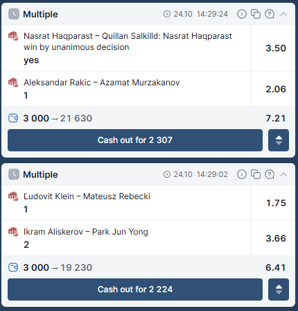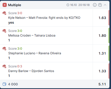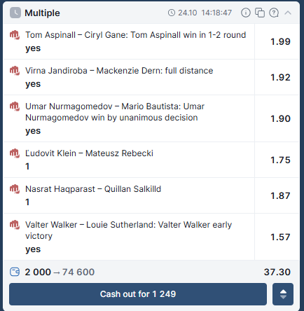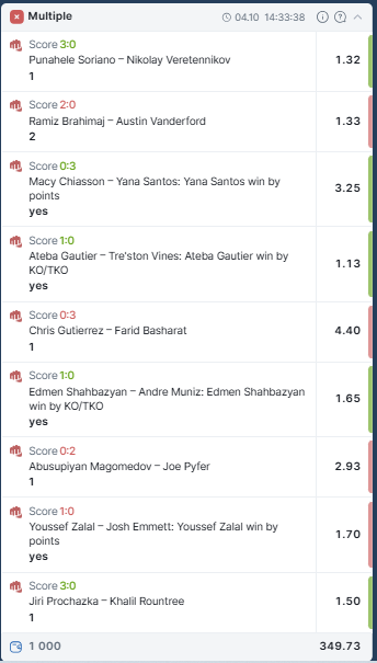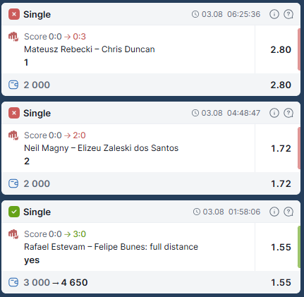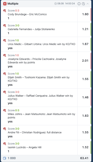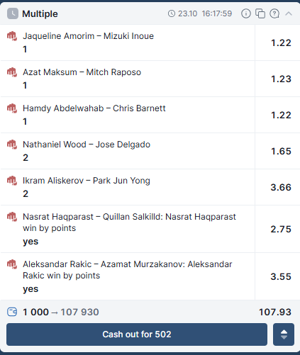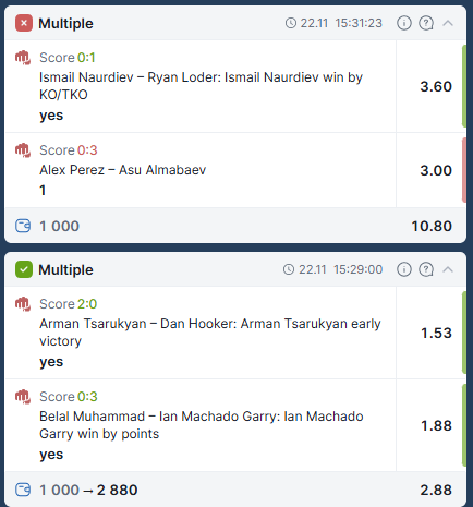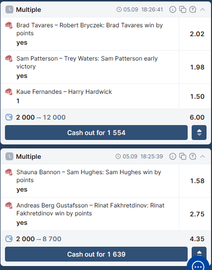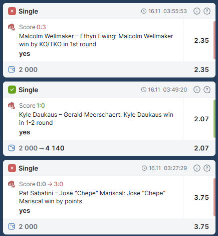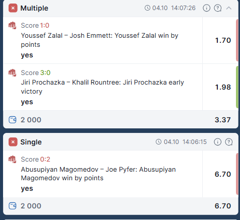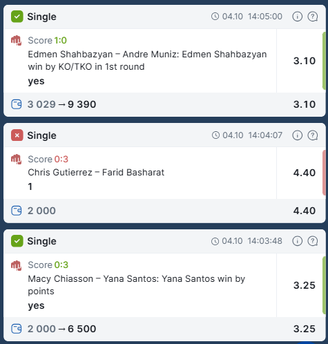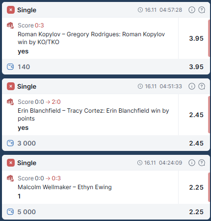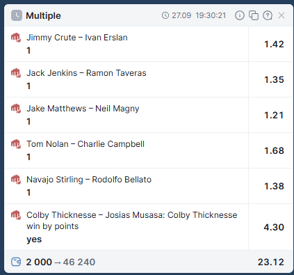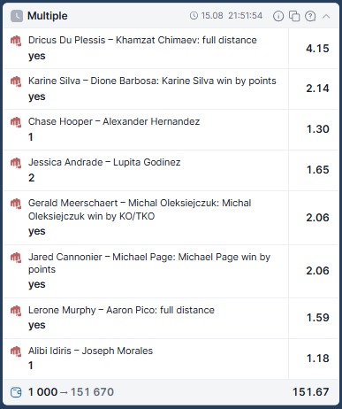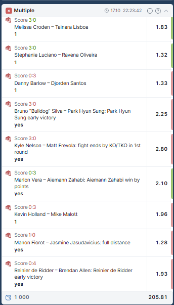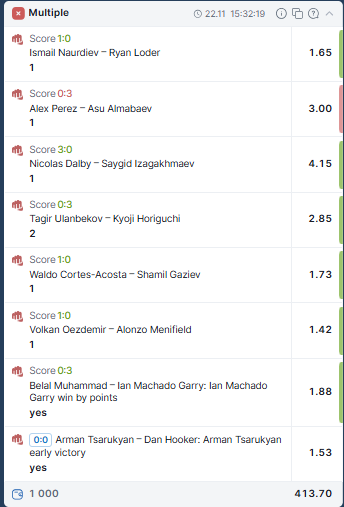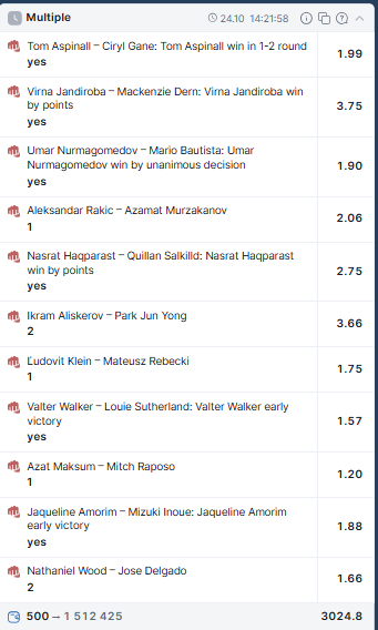 Экспрессы не залетают. В голове я постоянно прокручиваю мои упущенные шансы и это всегда ставка на одного бойца с результатом, который никто кроме меня не видел. Никто не видел Мераб побеждающий Умара решением, никто не видел Хамзата побеждающего Дрикуса решением. На них были отличные каэфы, но я не могу заставить себя зарядить серьёзную ставка на один бой и отбить свои деньги, я хочу зарабатывать много и ставить мало, но это просто не работает. Сработает ли этот ? Я не уверен.