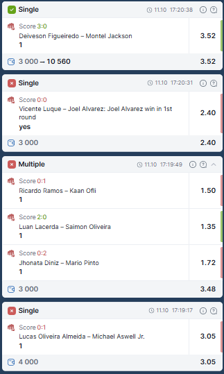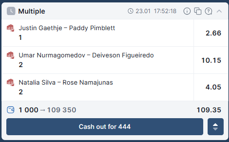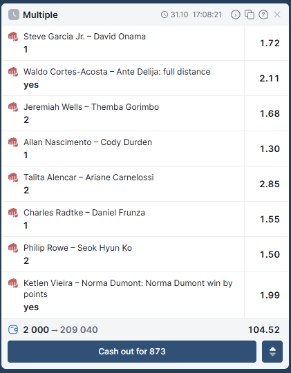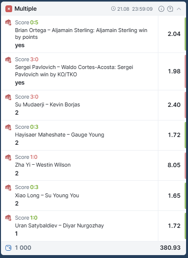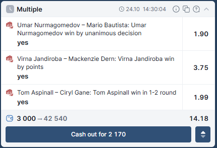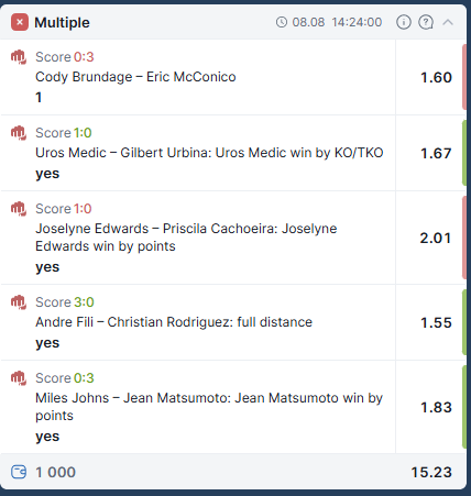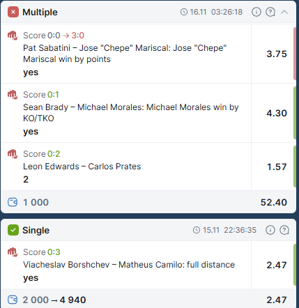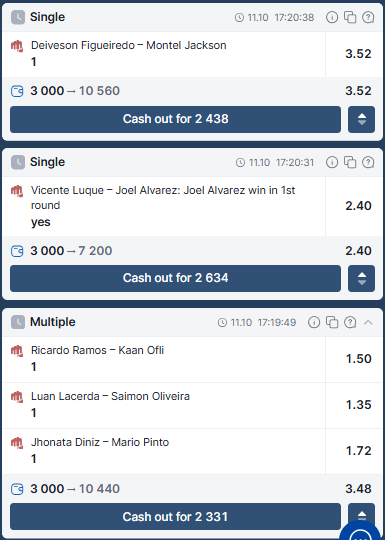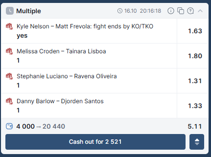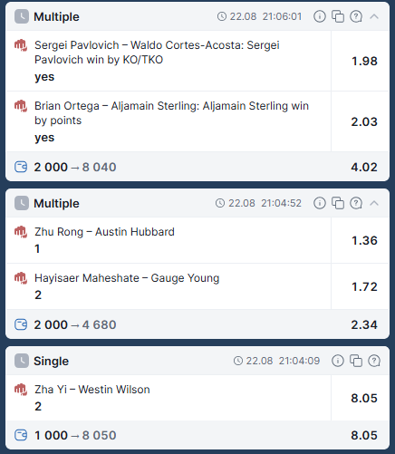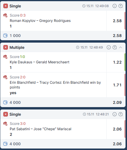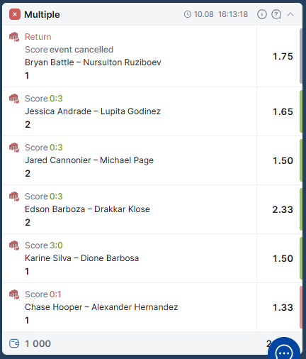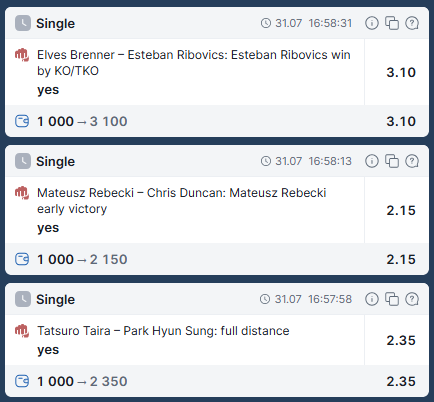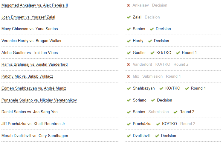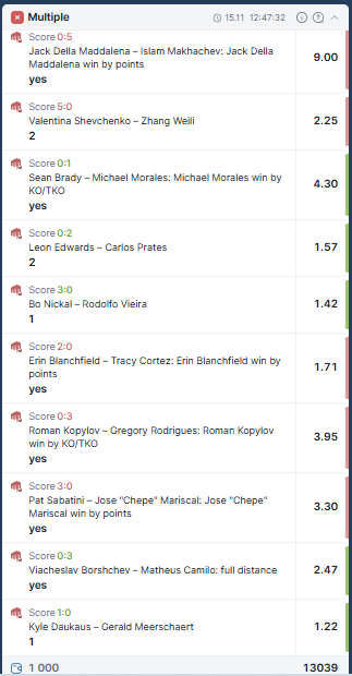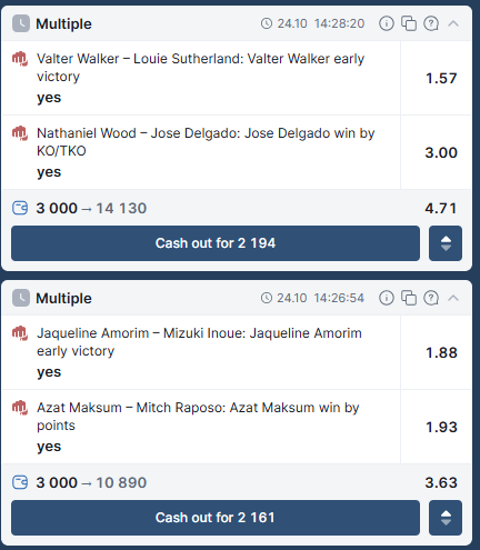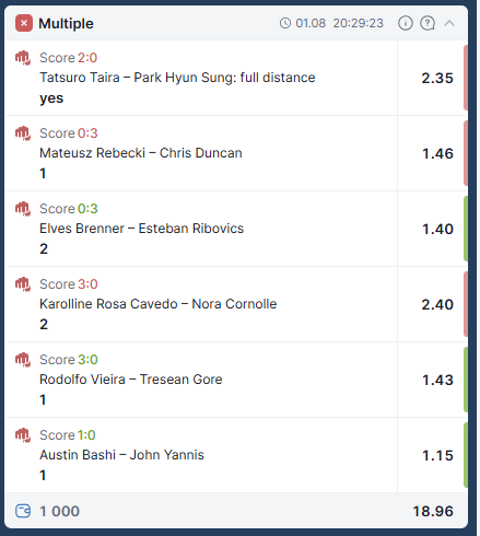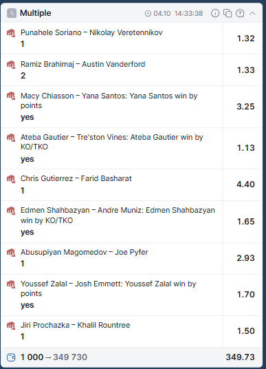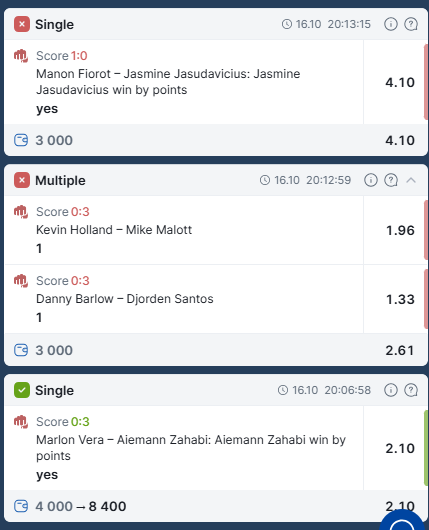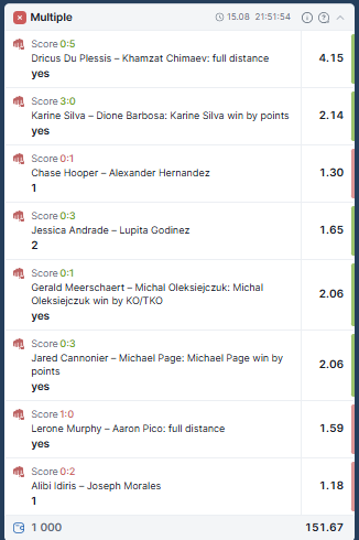 Экспрессы не залетают. В голове я постоянно прокручиваю мои упущенные шансы и это всегда ставка на одного бойца с результатом, который никто кроме меня не видел. Никто не видел Мераб побеждающий Умара решением, никто не видел Хамзата побеждающего Дрикуса решением. На них были отличные каэфы, но я не могу заставить себя зарядить серьёзную ставка на один бой и отбить свои деньги, я хочу зарабатывать много и ставить мало, но это просто не работает. Сработает ли этот ? Я не уверен.