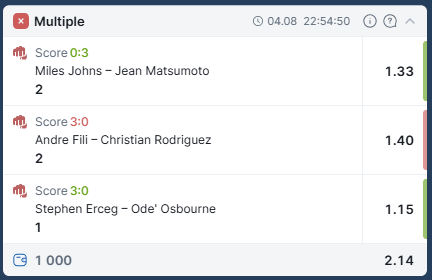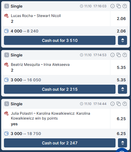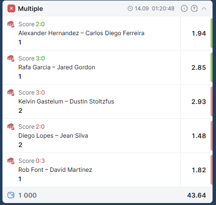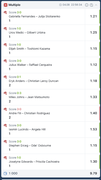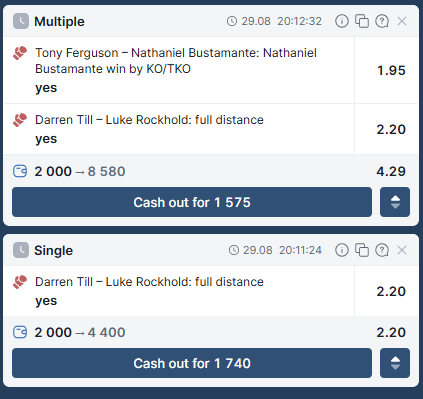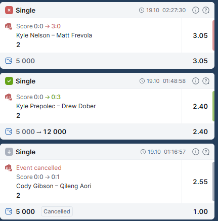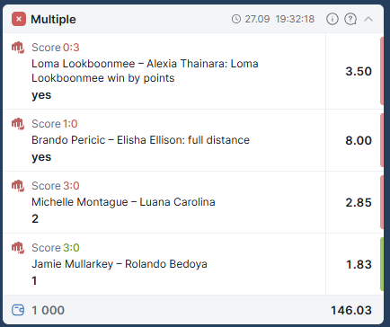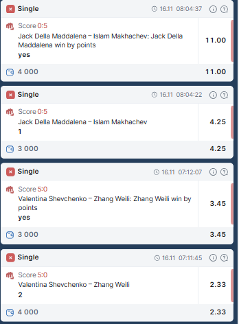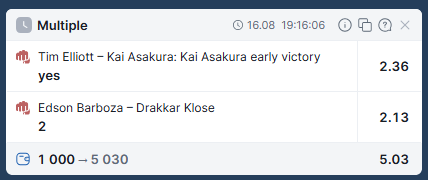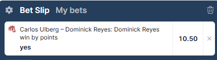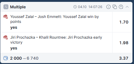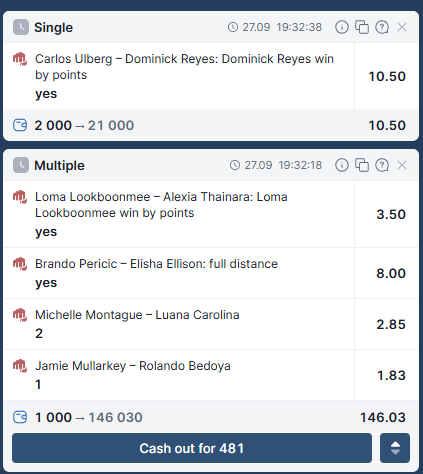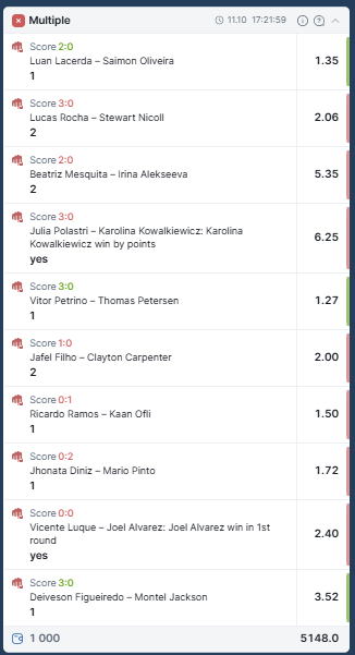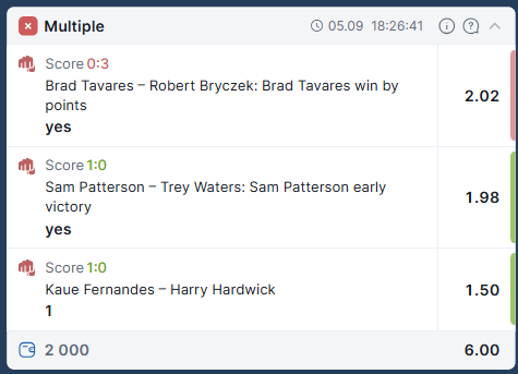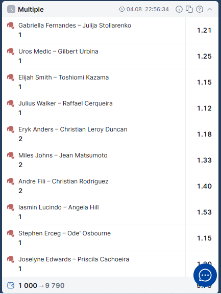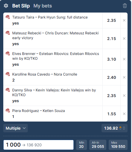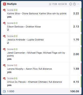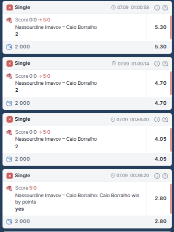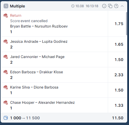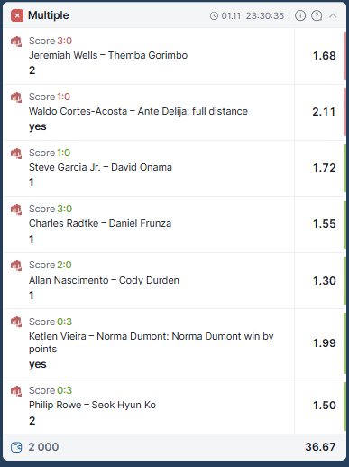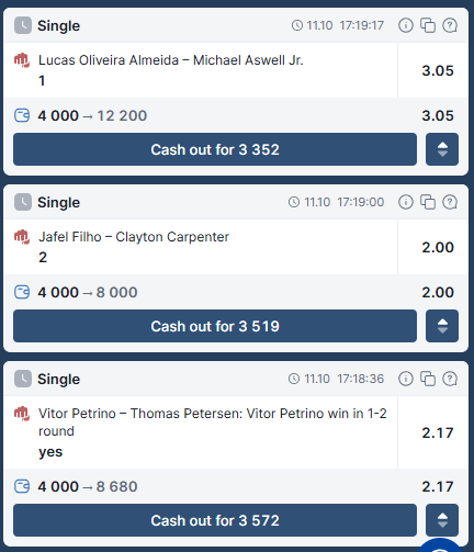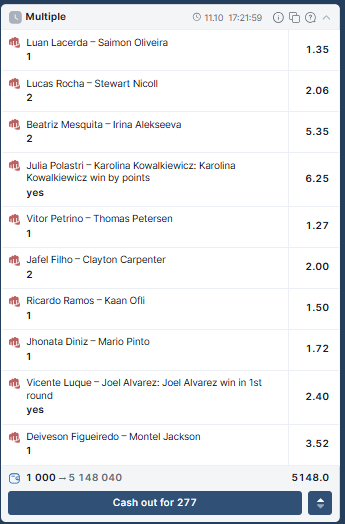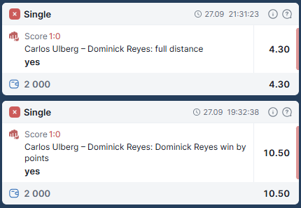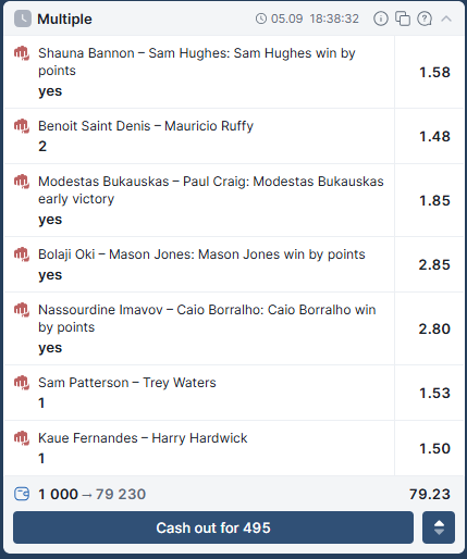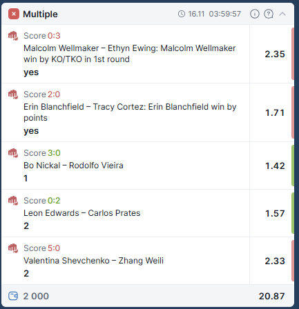 Экспрессы не залетают. В голове я постоянно прокручиваю мои упущенные шансы и это всегда ставка на одного бойца с результатом, который никто кроме меня не видел. Никто не видел Мераб побеждающий Умара решением, никто не видел Хамзата побеждающего Дрикуса решением. На них были отличные каэфы, но я не могу заставить себя зарядить серьёзную ставка на один бой и отбить свои деньги, я хочу зарабатывать много и ставить мало, но это просто не работает. Сработает ли этот ? Я не уверен.