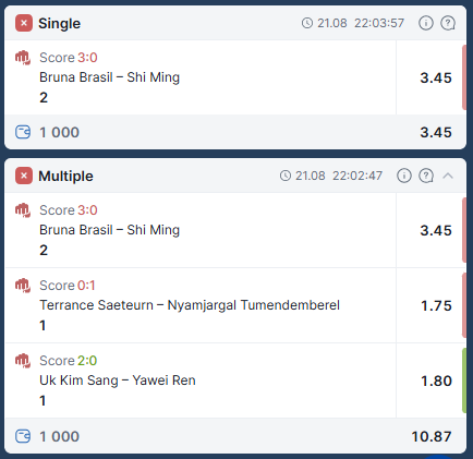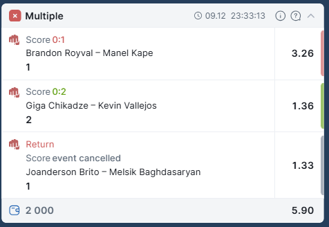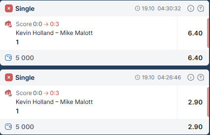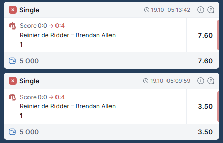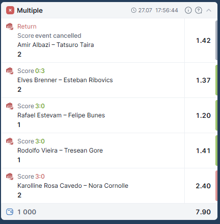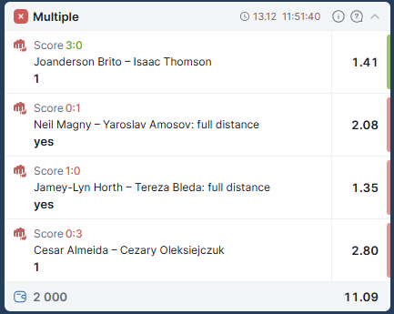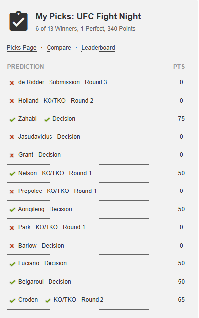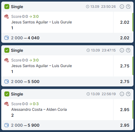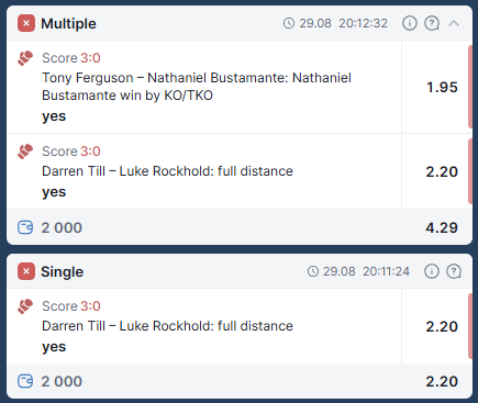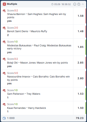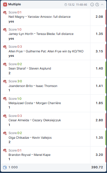 Провал колоссальный, но достаточно странный, я корректно угадал 8/13, но из 5, что идентифицировал не правильно, 2 были предвиден и сгруппированы в один экспресс, чтобы в случае чего ничего не испортить. 3 были неприятны, но не фатальны, что уничтожило меня, так это ставки на результат, я угадал только 2 и из 13, потому что на всём карде 11 финишей. То есть мои ставки одна за другой не смотря на то, что я знал победителя оборачивались провалом, потому что я не верно указал как скоро они победят.