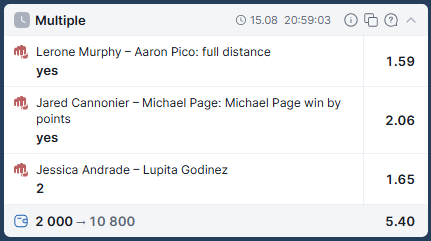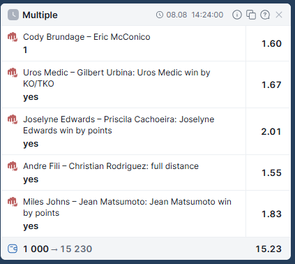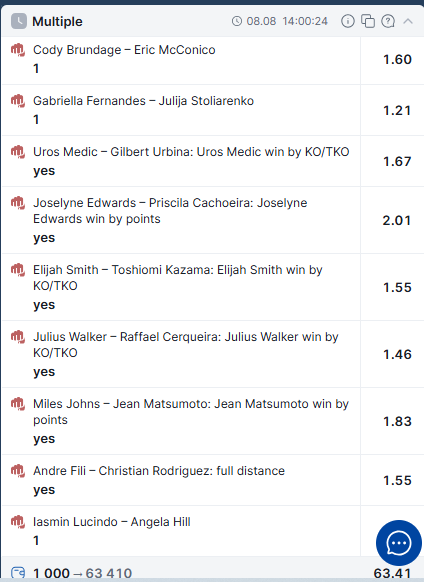 Мне кажется, что всё складывается очень хорошо, к сожалению я не смог найти ни одной чёрной лошадки, но мне кажется, что здесь, на этих экспрессах у меня выигрышная комбинация. Все эти бойцы второсортны, все они предсказуемы, все они были в такого типа боях, здесь более чем реально собрать адекватный экспресс. Есть те, в которых я уверен, есть те в которых я не слишком уверен. Но верю я во все.