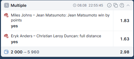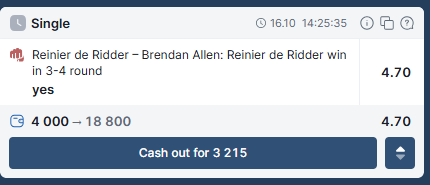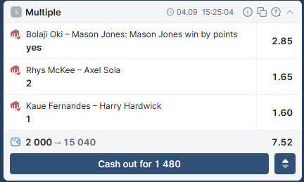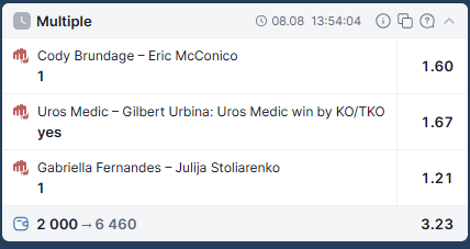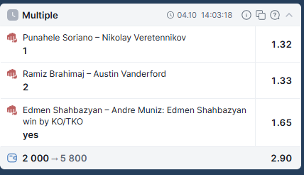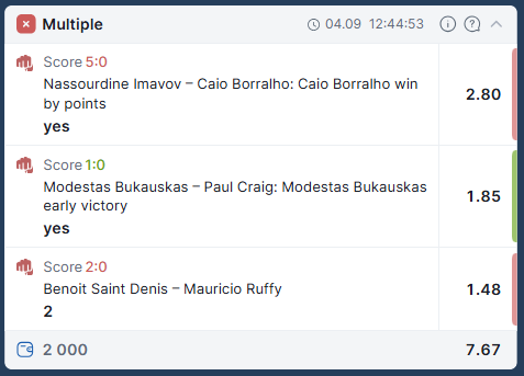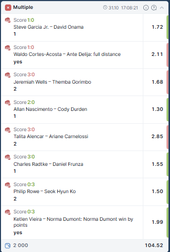 Первая ставОЧКА, чувствую себя очень уверенно по поводу: 1.Кай-левша решенатор, что лучше как атлет с лучшим кардио и граплингом, выходит против бойца, что ничего кроме джеба и 1-2 не умеет, при этом имеет тенденцию сдаваться, если бой становится слишком тяжёлым. Он чуть не проиграл Долидзе из-за этого и это после 10-8 в первом раунде. 2.Пол Крейг не сможет выстоять 3 раунда против любого оппонента способного выбросить удар. Его единственный путь к победе-это саб, но он не может бороться. Можно было ставить на нокич или первый раунд, но зачем рисковать, когда 1.85 ставочка на экспрессе и так хорошо сморится? Если выиграю рано перед боем занесу отдельную на особый финиш. 3.Я уверен в победе Руффи, Бенуа давно достиг своего потолка, проблема в том что я не уверен в том как Руффи победит, поэтому ставлю тока на победу.