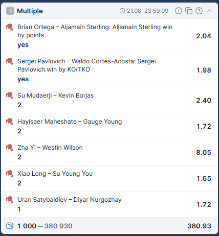 Мой большой экспресс. Получился чуть больше, чем ожидалось, но тока потому что ну уж очень жирный пёс попался. Уверен ли я в своих пиках ? Абсолютно нет. 1.Алджо решение звучит как очевидный результат, он как правило просто занимает позицию и держит её три раунда. Но у Браяна всегда может снова вылететь плечо или кто-нибудь начнёт елозить и попадёт в саб. И это мой лучший пик, в нём я более всех остальных уверен. 2.Палыч должен сносить Косту, Лолкова он не мог достать, а Струка он объективно боялся, но щас бояться нечего, просто здоровый негр. Опять же, бойцов из тяжёлого начали увольнять за решения. 3.Су мошенник. 4.Оба неудачники, но Молодой проигрывал лучшим людям в лучшей манере. 5.Жа-мошенник, Вилсон опасен как на земле, так и в стойке, любит финиш, может снести. 6.Я хотел поставить на корейца. 7.Кыргыз здоровее и проиграл дейбют лучше. Я не знаю, если честно. Мне даже спаренный экспресс строшно собрать, если честно. В одиночных ставках я не уверен так же как н уверен в экспрессах. В моей голове выигрышь не оправдывает риск.