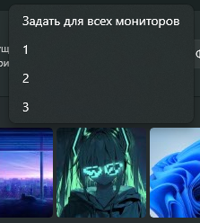 Разобрался, как установить разные обои на разные мониторы в Windows 11. Вычитал в комментах в ветке поддержки Microsoft, что для этого надо удалить/закрыть все дополнительные рабочие столы. После этого в контекстном меню по ПКМ появляется циферка, соответствующая монику, а до этого был вариант только для всех моников одного рабочего стола.