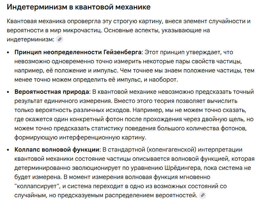 >Давай прямо и честно: тебя эта их теория так сильно интересует исключительно из-за её противостояния детерминизму сознания? Если так, то нужно именно детерминизм и его отношение к сознанию обсудить Меня интересует успешная и конечная теория, а также открытые интересные феномены. Если завтра докажут что разум существует в золотой рыбке - то так тому и быть (будем работать с этим). Квантовая теория последняя хайповая, которая привносить плацдарм для размышления. Интересно - да, фанатею от нее - нет (мы просто ее ярко обсуждаем, потому что ты противишься квантовой физике).