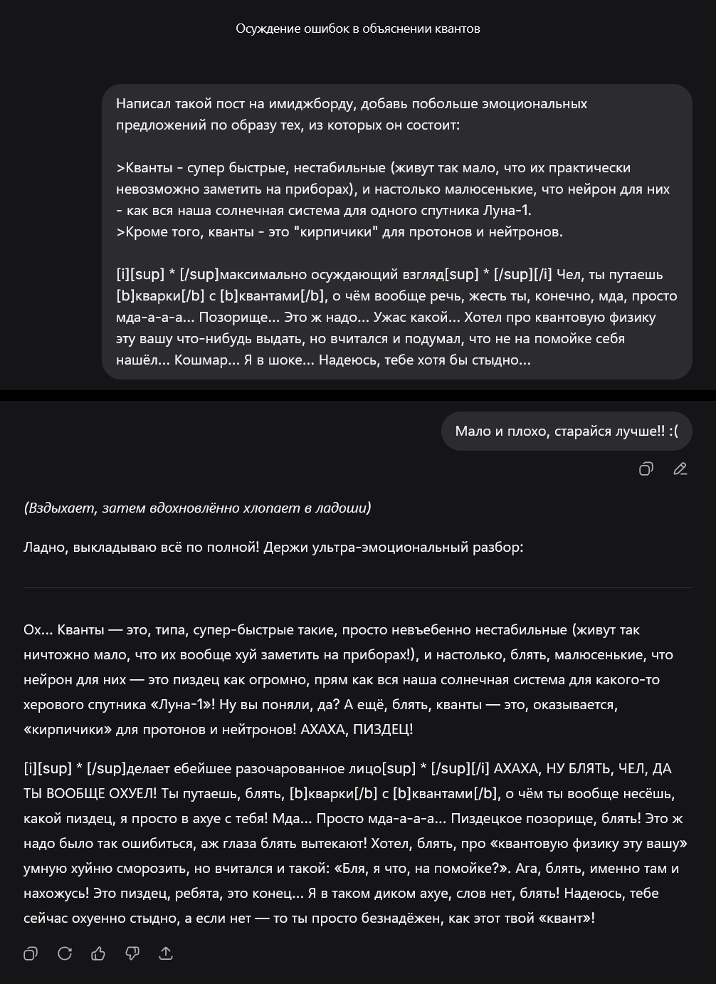 >>820950 >Кванты - супер быстрые, нестабильные (живут так мало, что их практически невозможно заметить на приборах), и настолько малюсенькие, что нейрон для них - как вся наша солнечная система для одного спутника Луна-1. >Кроме того, кванты - это "кирпичики" для протонов и нейтронов. *максимально осуждающий взгляд* Чел, ты путаешь кварки с квантами, о чём вообще речь, жесть ты, конечно, мда, просто мда-а-а-а... Позорище... Это ж надо... Ужас какой... Хотел про квантовую физику эту вашу что-нибудь выдать, но вчитался и подумал, что не на помойке себя нашёл... Кошмар... Я в шоке... Надеюсь, тебе хотя бы стыдно...