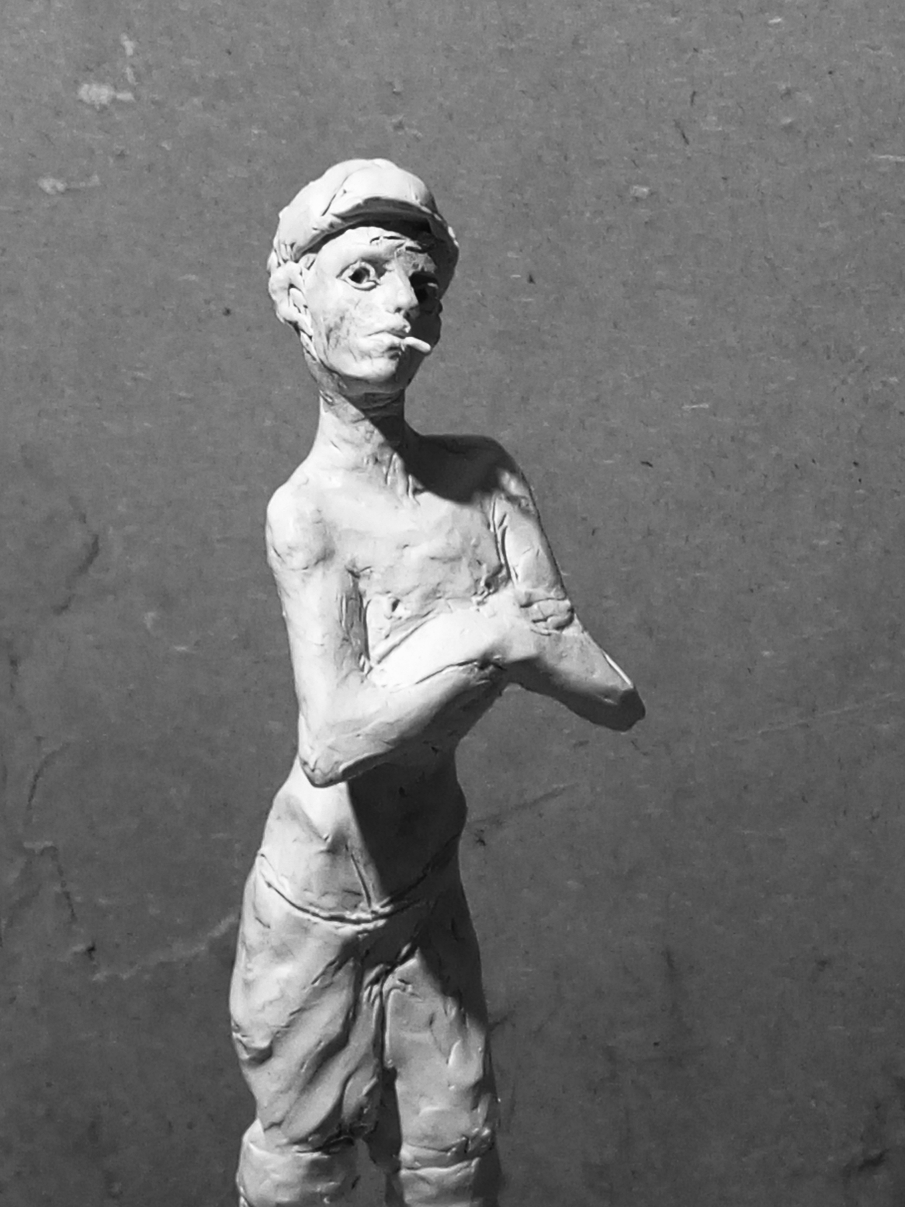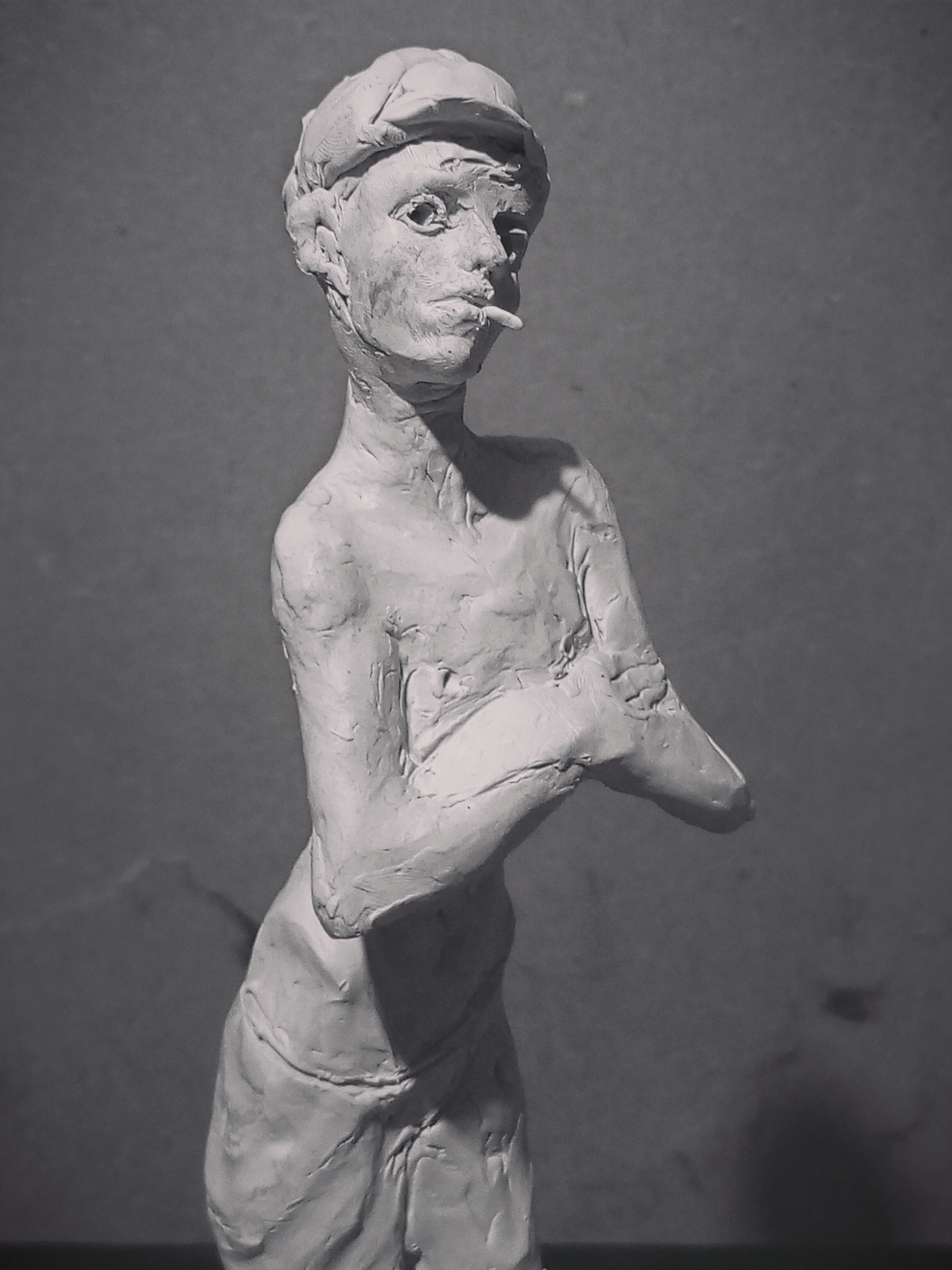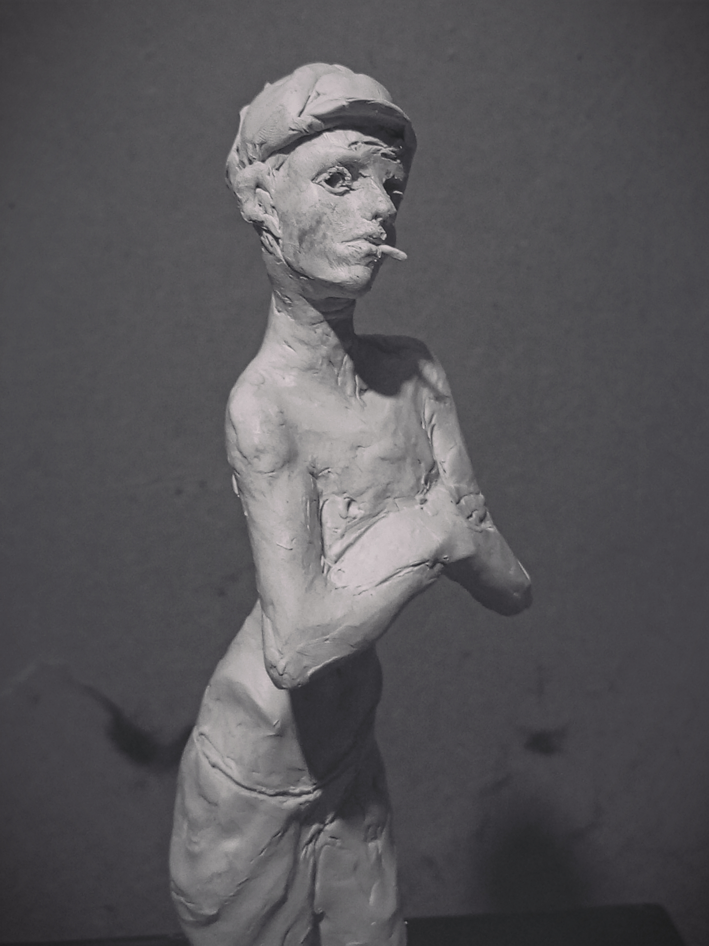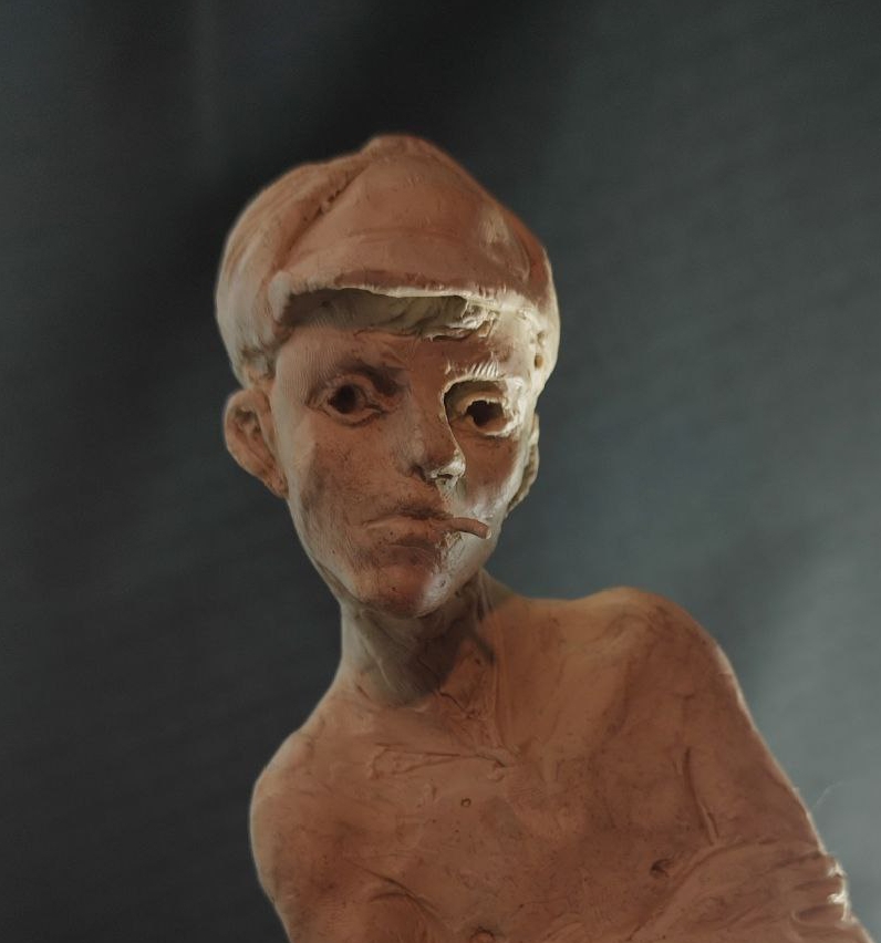 я на самом деле изначально хотел слепить другую фигуру мальчика косящего серпом траву но потом подумал что это какая-то социалреалистическая совкопошлятина + лицо наглое стало получаться у к него решил сделать безпризорника 20-х годов смотрел фильм еще советский в детстве вот вспомнилось и навеяло мне чесна говоря уже не особо нравится результат как собственно у всех своих работ но мь и отнесу в отливку никогда свои работы до этого не формовал