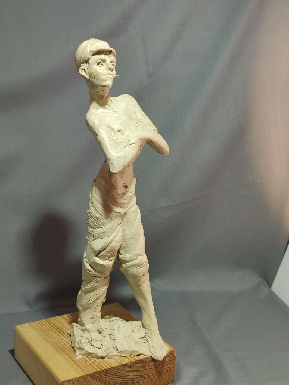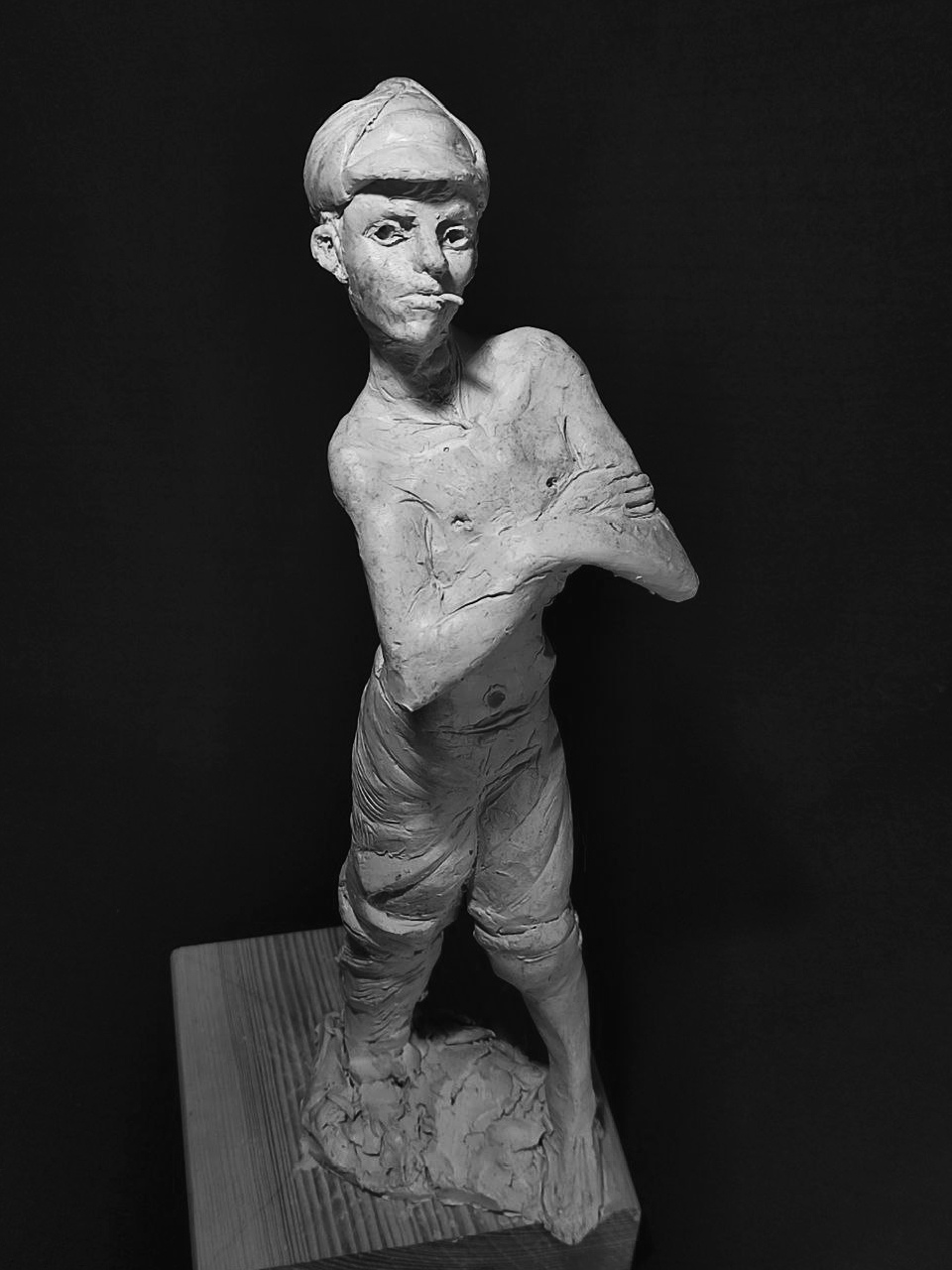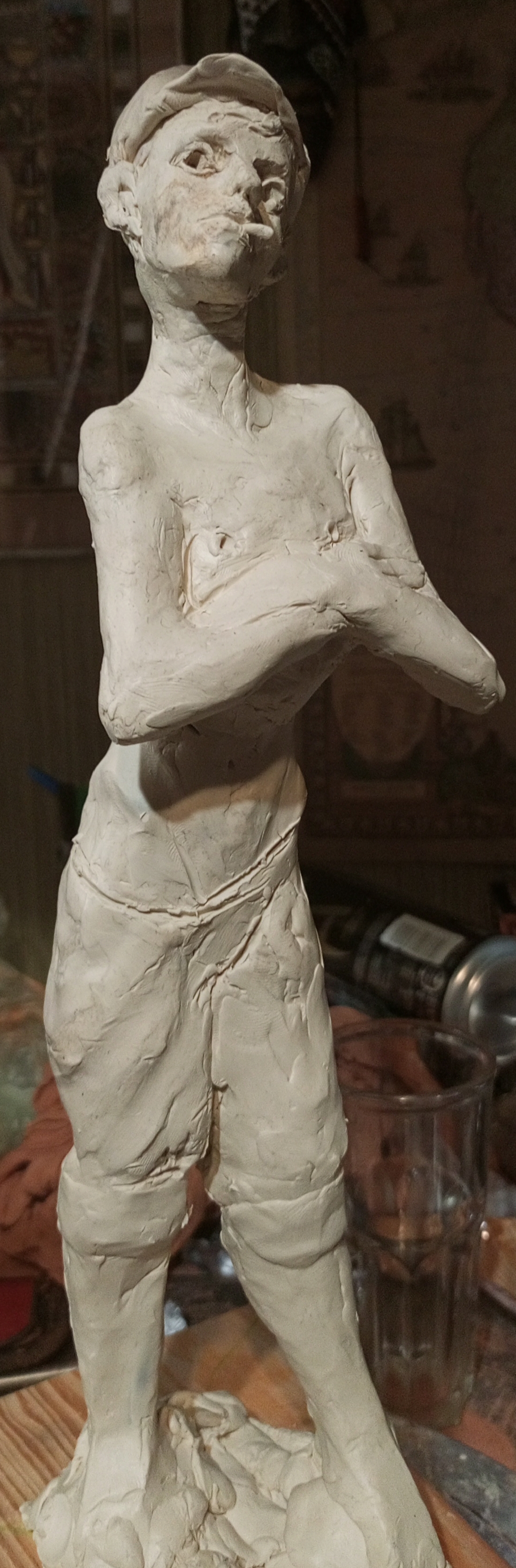 я на самом деле изначально хотел слепить другую фигуру мальчика косящего серпом траву но потом подумал что это какая-то социалреалистическая совкопошлятина + лицо наглое стало получаться у к него решил сделать безпризорника 20-х годов смотрел фильм еще советский в детстве вот вспомнилось и навеяло мне чесна говоря уже не особо нравится результат как собственно у всех своих работ но мь и отнесу в отливку никогда свои работы до этого не формовал