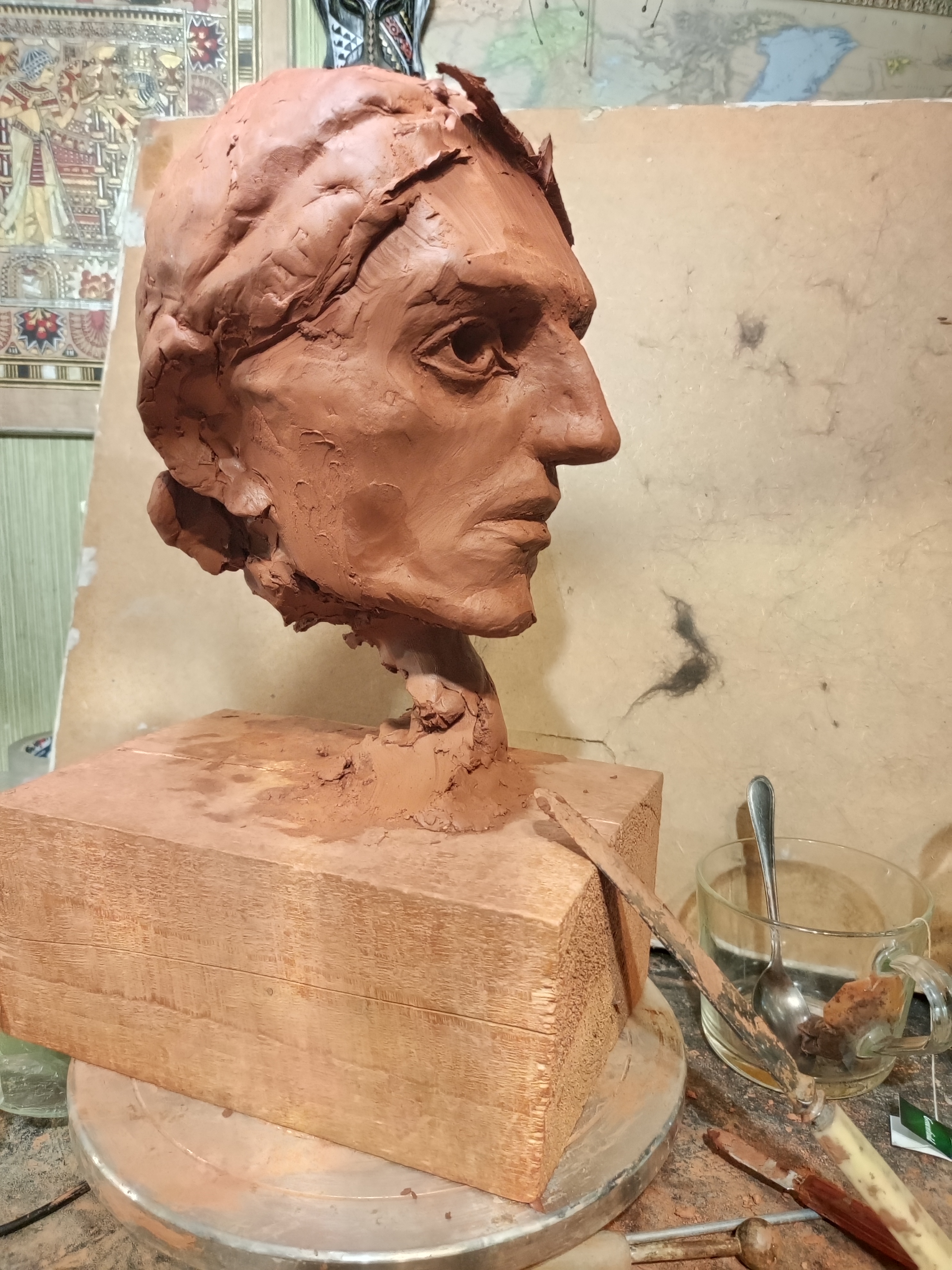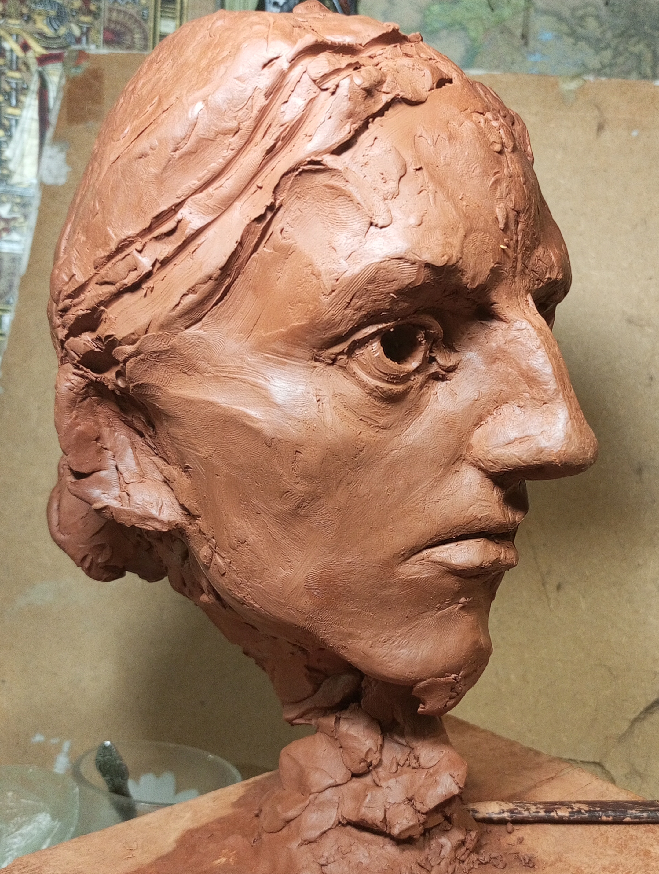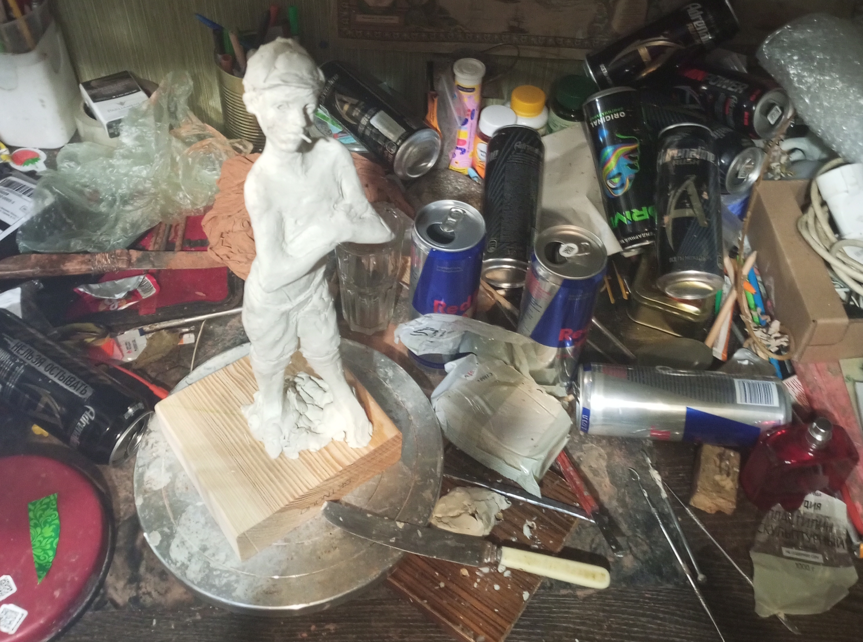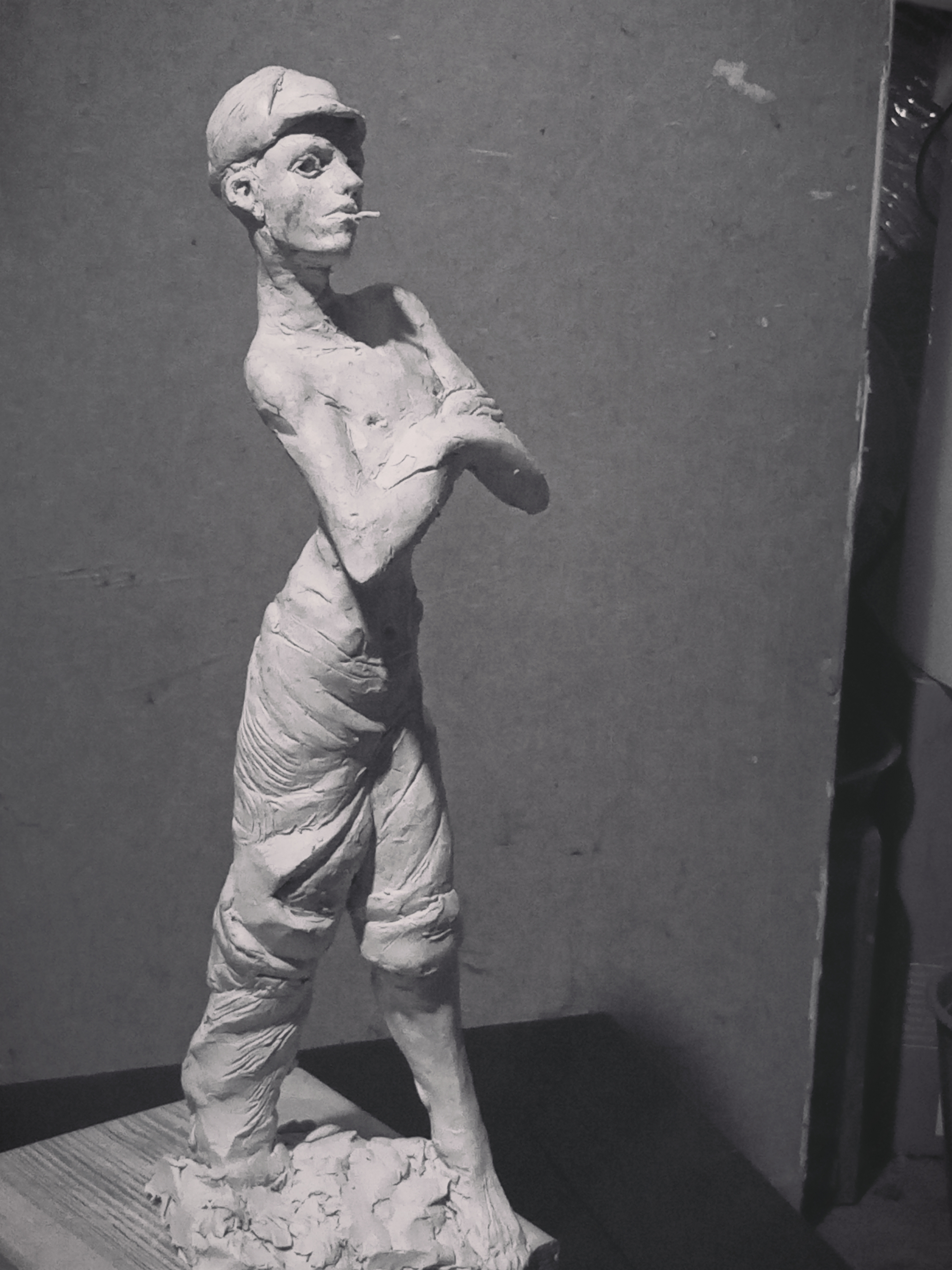 я на самом деле изначально хотел слепить другую фигуру мальчика косящего серпом траву но потом подумал что это какая-то социалреалистическая совкопошлятина + лицо наглое стало получаться у к него решил сделать безпризорника 20-х годов смотрел фильм еще советский в детстве вот вспомнилось и навеяло мне чесна говоря уже не особо нравится результат как собственно у всех своих работ но мь и отнесу в отливку никогда свои работы до этого не формовал