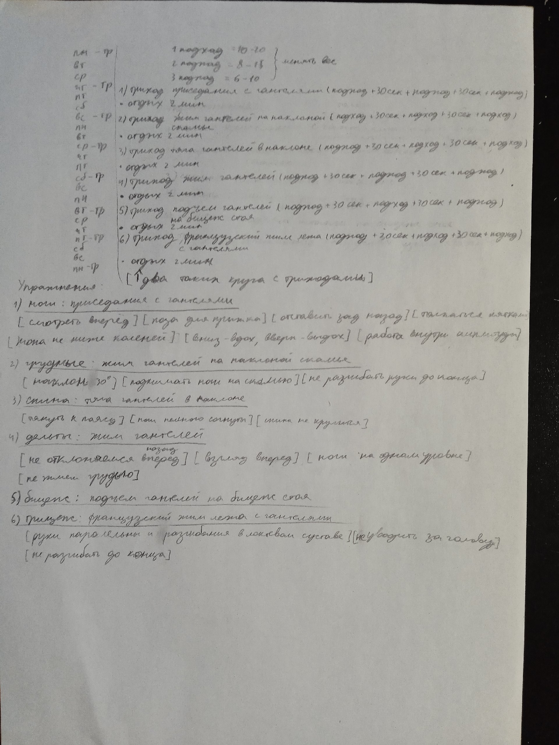 сегодняшняя тренировка была без прогрессии и даже наоборот результаты уменьшились, возможно потому что последние 2 дня плохо спал, возможно повлияло то, что сегодня много ходил, где то километров 10 наверно. в любом случае решил увеличить свой рацион на 100ккалорий и довести его до 2100ккалорий и увеличит отдых до 2-х дней, в любом случае я подошел к своим рабочим весам, правда на ноги меньше потому что даже с гантелями на плечах все равно руки напрягаются, так то ногами я могу и больше делать вес, но руки просто не вывезут.