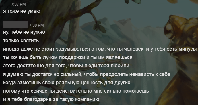 Единственное, что мне нужно в этой жизни — это общение с другими людьми. Критическую важность имеет наличие в моей жизни фп, по которому я могу сходить с ума и стараться ради существования этого человека. Вся моя жизнь становится зеркалом желаний этого человека. Меня это устраивает. Мне нравится так жить. Я делаю кого-то счастливым и это счастье становится моим счастьем. Такое существование - моё счастье. Но со всеми моими последними фп всё было очень плохо. Просто и я, и они, друг другу не подходили в базовых моментах — такое бывает. Я не грущу по этому поводу.