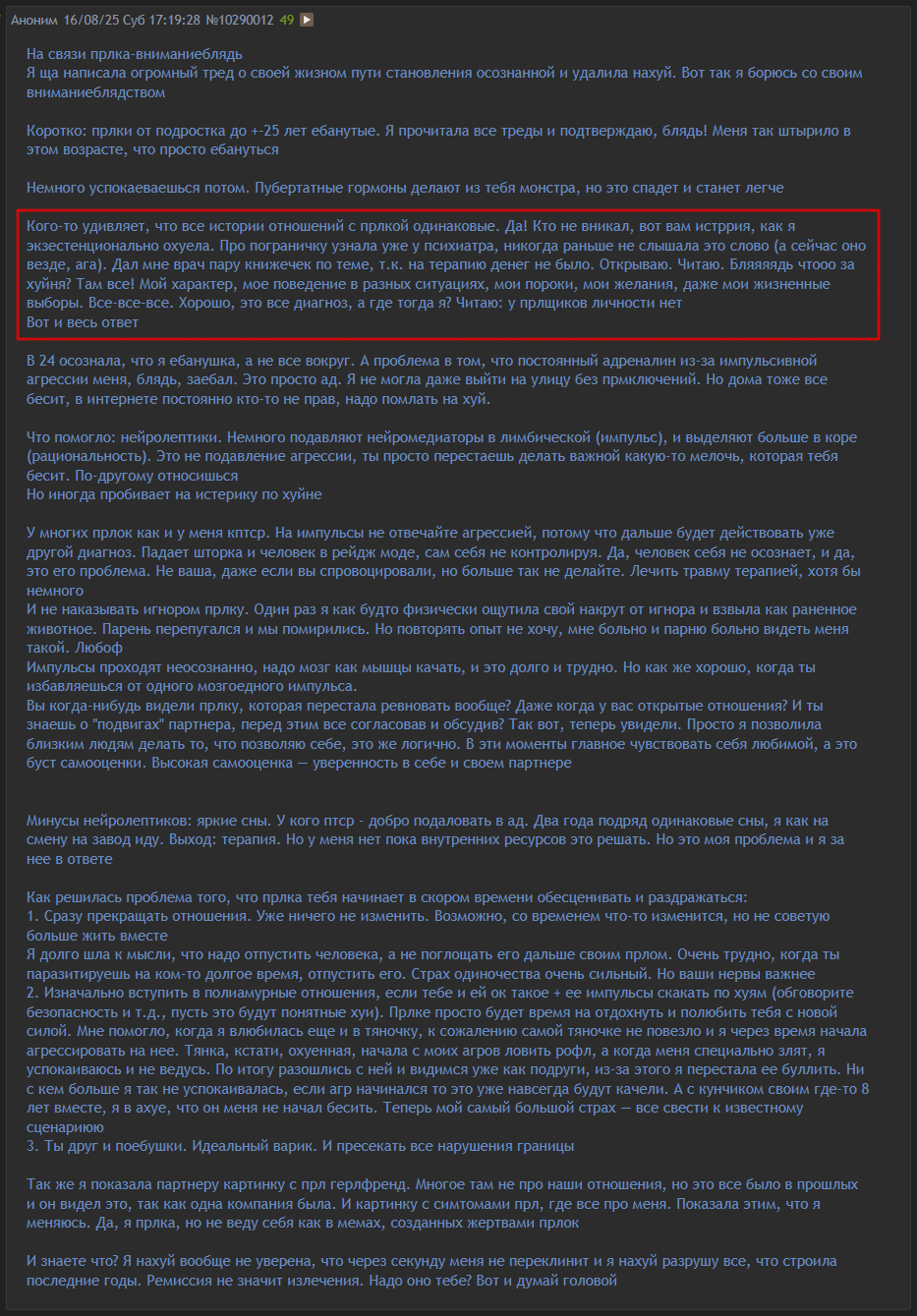 Если убрать шизу и прочие мелочи (КПТСР там, не разбираюсь...), то это ОП, не конкретно потому, что я сейчас описал, а в целом. В основном по части того, что описывают как это ваше ПРЛ: неустойчивые отношения, СТРАХ БЫТЬ БРОШЕННЫМ, ВНУТРЕННЮЮ ПУСТОТУ (вот паста из /sex/ (не спрашивай, что я там забыл) на второй картинке: «Хорошо, это всё диагноз, а где тогда я? Читаю: „У ПРЛщиков личности нет“»), злоупотребление веществами... да более-менее все пункты из >>815937>>815937 мапятся в пункты из https://www.reddit.com/r/BPDWiki/wiki/symptoms/.