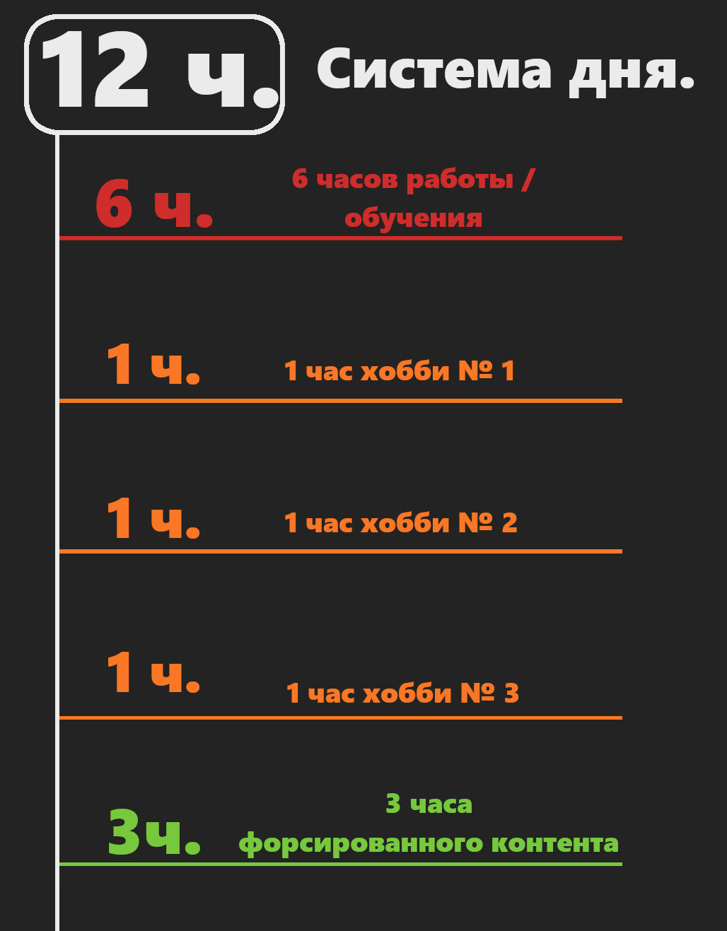 Я долго думал чем хочу заниматься по жизни, какие у меня вообще цели и кем я буду становиться. В итоге все пришло к айти. Да, это хоть и немного звучит смешно и заезжено, но к этому у меня действительно страсть. Был даже момент моей жизни когда я пытался учится кодить ради создания мода к одной игре, но благополучно забил на все болт и отправился дальше LDAR. Немного люблю математику и планирую ей тоже обучаться. Так же имея комплексы по поводу своего интеллекта, который я оцениваю ниже среднего, я хочу закончить ВУЗик, хоть какой-то хотя бы, и получить вышку, чтобы просто быть как все, а не тупым необразованным быдло. Мой дальнейший план выглядит примерно так: Я устраиваюсь на работу, параллельно готовлюсь к ЕГЭ, который я в прошлом завалил из-за непонимания зачем и что это вообще такое. Моя цель 270 баллов, после которых я поступлю в своем городке на какой-нибудь бюджет на айти специальность чтобы убить двух зайцев одновременно, семейных денег на платку мне не дадут с моим отношениям к жизни, этот разговор уже состоялся и перемен не предвидится. Далее я учусь в ВУЗе, параллельно сам качая свои скиллы программирования и математики, возможно устраиваюсь на айтишную работу на 3-4 курсе, а дальше как пойдет. Даже если и нейросетки меня заменят я не расстроюсь, этот путь как минимум лично мне принесет достаточно удовольствия и уверенности, а там посмотрим что будет. Так же я устал быть неинтересным скучным долбоебом, потому вкат в хоббцелство просто необходим. Я разработал схему 6-1-1-1-3. 6 часов обучения, 1 час хобби, час второго хобби, час третьего, 3 часа форсированного развлечения вроде игр или фильмов, потому что за несколько лет LDAR я совершенно потерял концентрацию внимания, без которого я даже не могу нормально отсидеть 1 фильм длинною в полтора часа и это надо фиксить незамедлительно. Так же я планирую сесть на диету, похудеть, начать заниматься спортом вроде калистеники и много чего еще в жизни перепробовать. Так что поехали. Начинаю с завтрашнего дня.