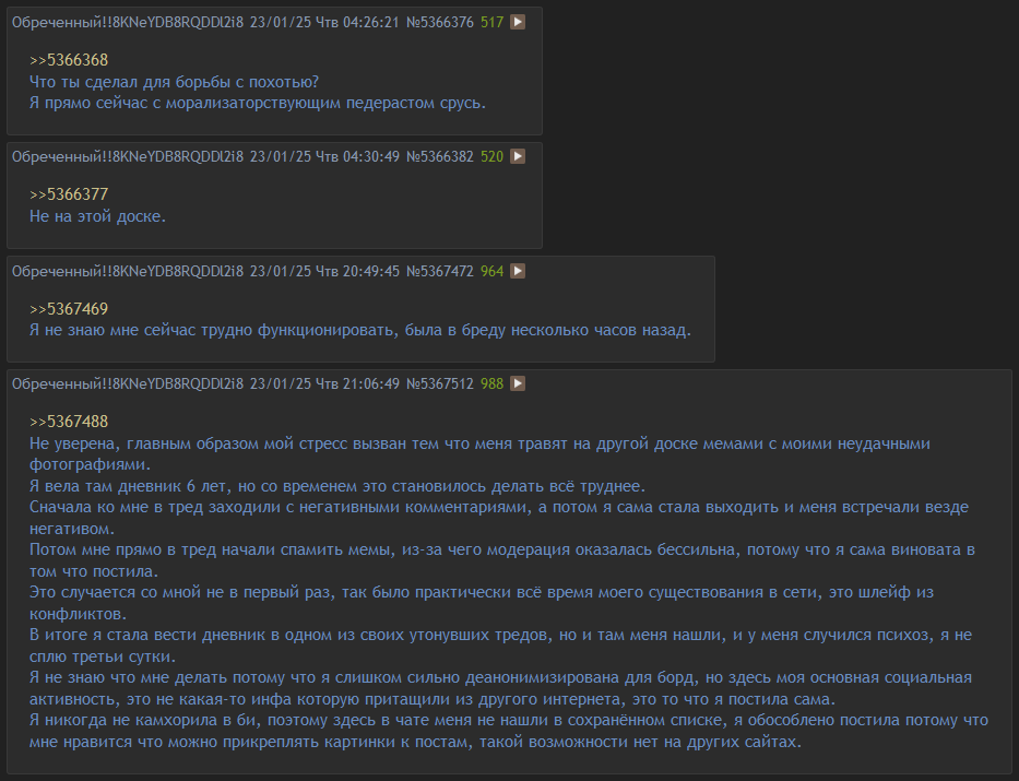мои тредв гдето есть на архиваче. но врядли будет интересно читать юношеские пиздострадания(мне по моему 16 или 17 было) видос пиздец жду, все кружочки смотрю