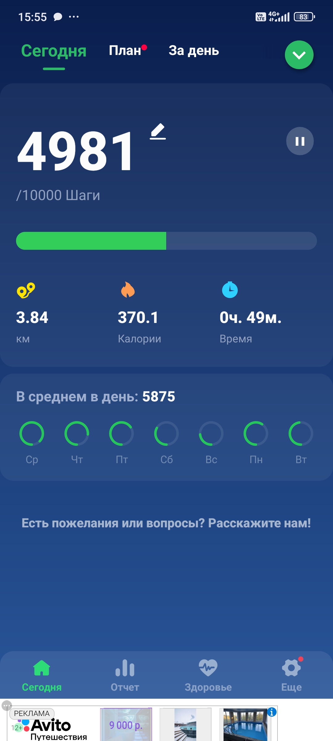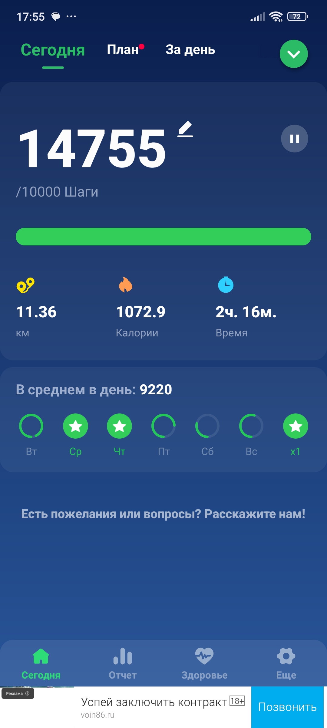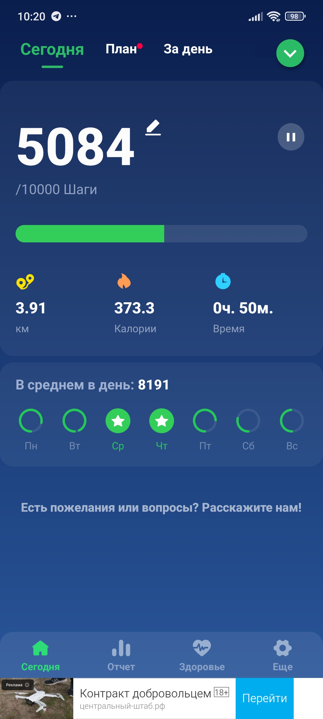 >>829249 Я вот тоже недавно приобрел привычку каждый день проходить одинаковый маршрут примерно в 6 км. Это как раз приблизительно 10 тысяч шагов или 1 час с небольшим суммарного времени нахождения на улице.