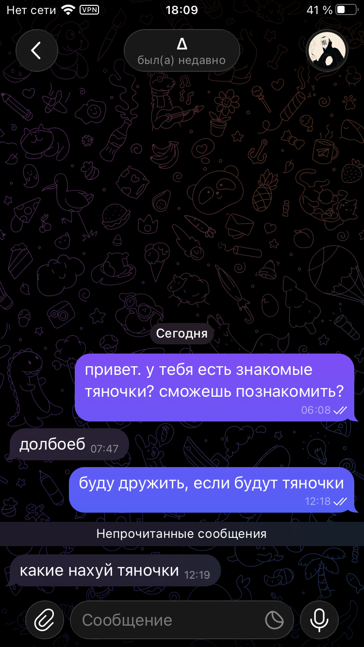 написал фембою короче, предложил ему дружить. ещё тянкам каким-то написал. не знаю, коммуницировать в социуме ето так сложно. надо следить за внешкой, держаться не как додик: в плане не трястись, двигаться плавно, уверено, голос чтобы не дрожал, мимика привлекательная; ещё надо быть энергичным, а не лохом в ангедонии, уметь говорить красиво, предложения строить - ораторское искусство минимальное короче; ещё быть остроумным, чё-то там изображать из себя начитанного, знающего человека. короче нормисом быть - это пиздец работа. каким додиком надо быть, чтобы к ним снисходительно относиться? ето гладиаторы настоящие, выжившие в таких замесах.