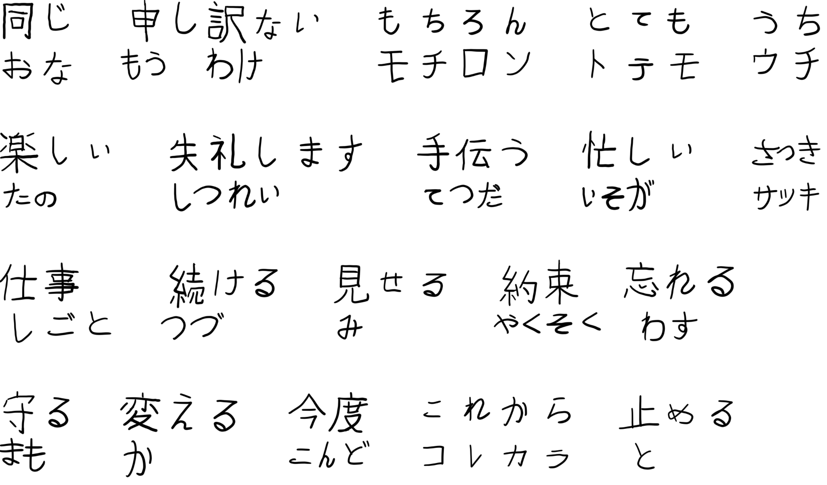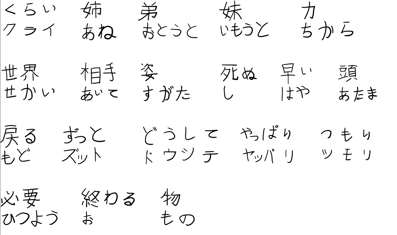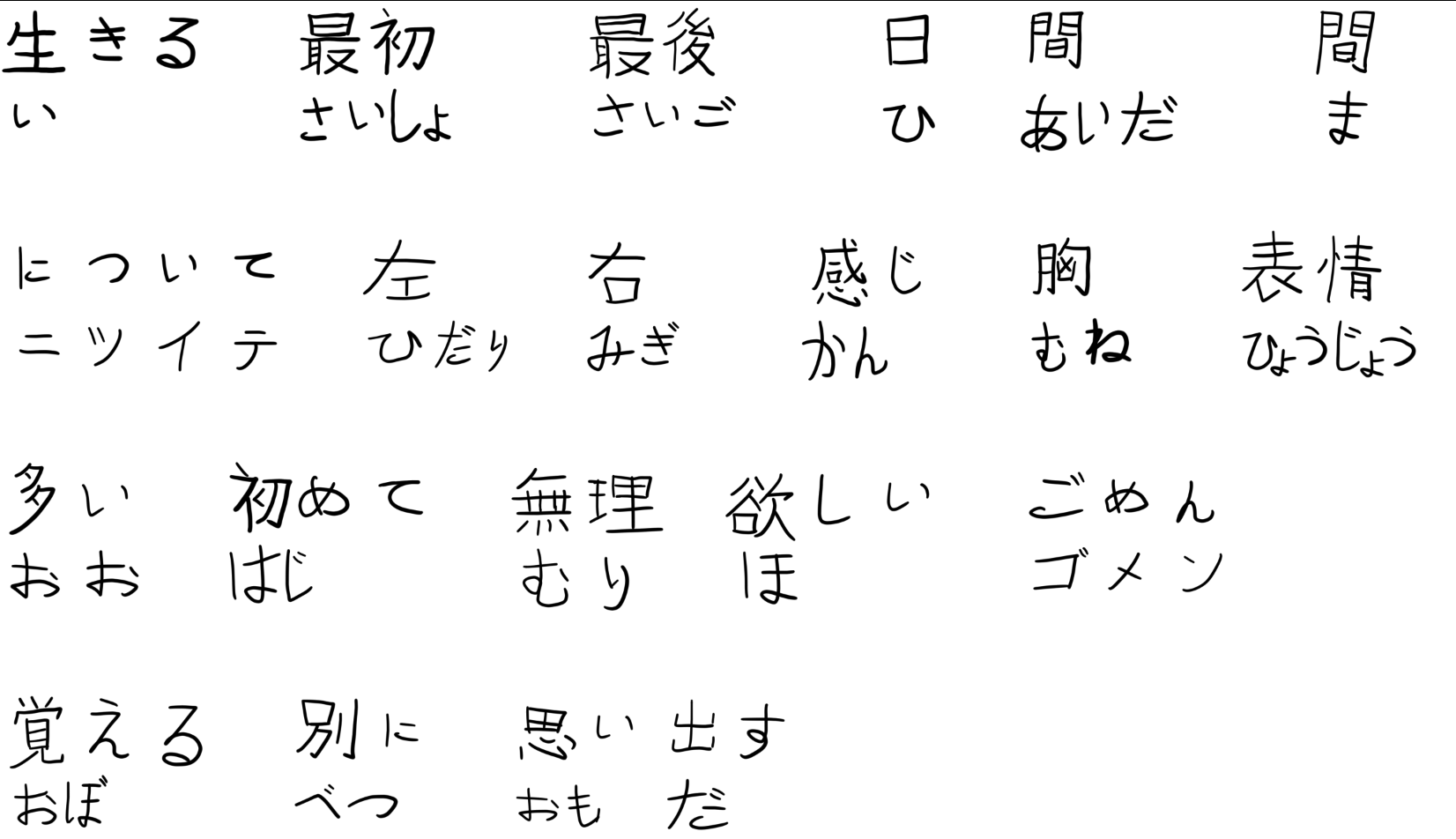 В прошлые разы когда делал таблицу - ловил демотивацию. Но сейчас было наоборот. Потому что многие слова, которые всего неделю назад для меня были просто набором символом - сейчас прочно засел в голове. Например 出来る. Оно у меня липучее и я много с ним фейлил, но увидев его сейчас я легко и прочёл его и значение назвал. Это приятное ощущение.