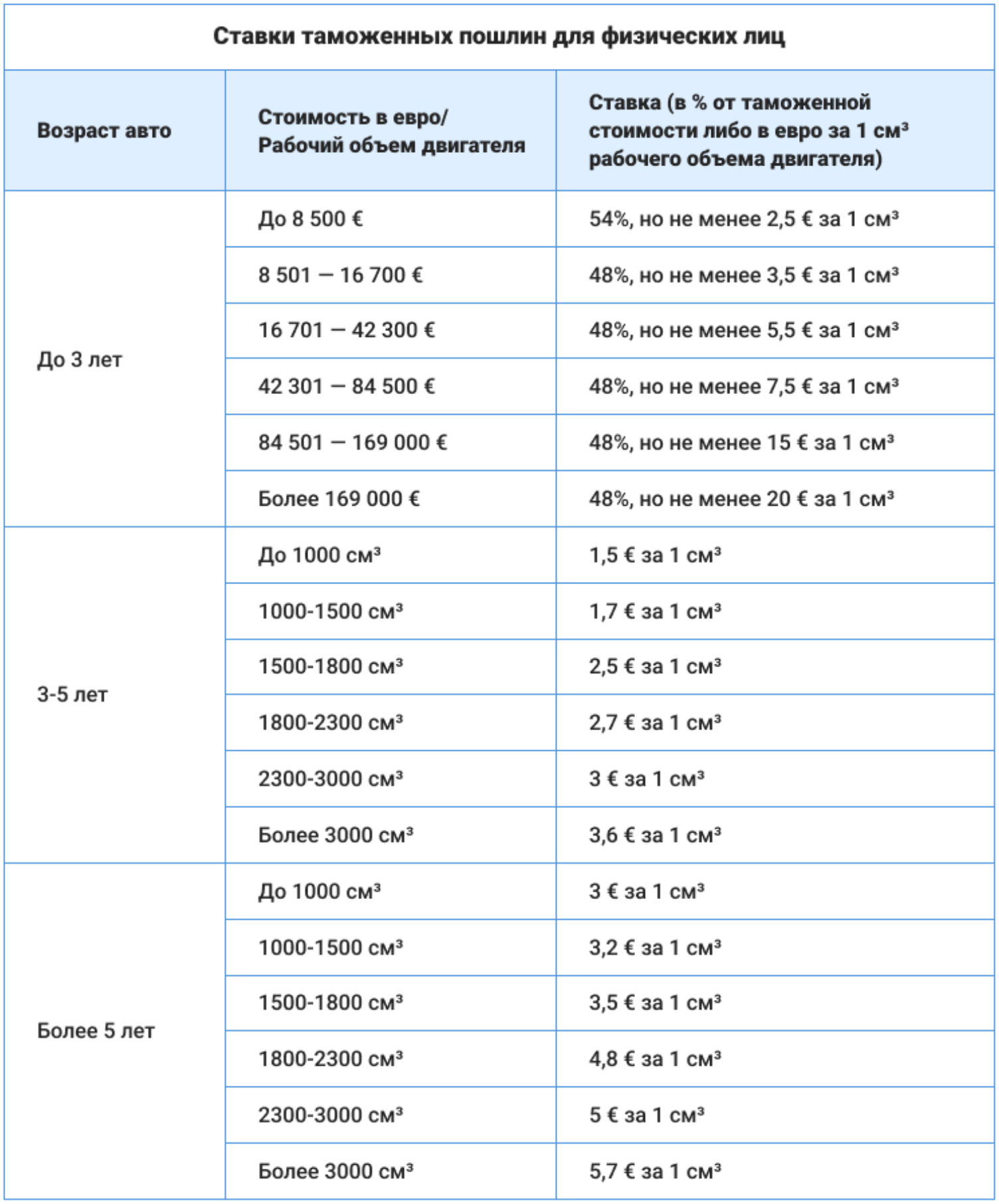 >>1235610 >тащемто до ноября 2025 все желающие могут привезти себе 3х летнее авто с двиглом до 3литров включительно любой мощности > >заплатив при этом утильсбор размером аж 5200 рублей Ага только физики еще и пошлину платят помимо утиля. А пошлина для физика на машины от 3 лет привязана к евро и объему двигателя. На новую машину до 3 лет пошлина 48% от таможенной стоимости.