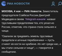 Напоминаю тебе анон, пикрил, это не хек с горы заявил, а зампред совбеза рф и бывш преподаватель права на юрфаке ЛГУ., т.е. юрист который по пустякам уголовными определениями не бросается. Подумай сто раз перед забегом на пупырки, нужно ли тебе предательство в биографию записывать.