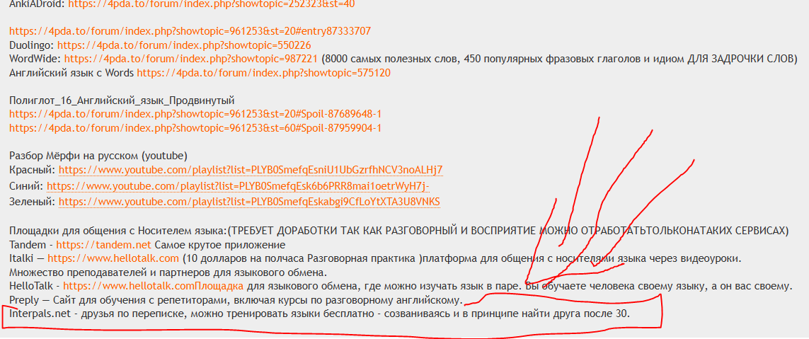 Площадки для общения с Носителем языка:(ТРЕБУЕТ ДОРАБОТКИ ТАК КАК РАЗГОВОРНЫЙ И ВОСПРИЯТИЕ МОЖНО ОТРАБОТАТЬТОЛЬКОНАТАКИХ СЕРВИСАХ) Tandem - https://tandem.net Самое крутое приложение Italki — https://www.hellotalk.com (10 долларов на полчаса Разговорная практика )платформа для общения с носителями языка через видеоуроки. Множество преподавателей и партнеров для языкового обмена. HelloTalk - https://www.hellotalk.comПлощадка для языкового обмена, где можно изучать язык в паре. Вы обучаете человека своему языку, а он вас своему. Preply — Cайт для обучения с репетиторами, включая курсы по разговорному английскому. Interpals.net - друзья по переписке, можно тренировать языки бесплатно - созваниваясь и в принципе найти друга после 30.