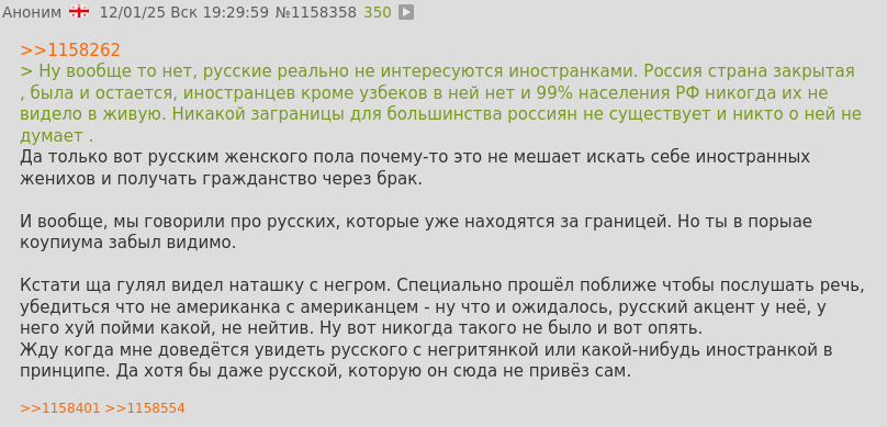 Здесь анон хвастается своими вымышленными сексуально-любовными похождениями с иностранками