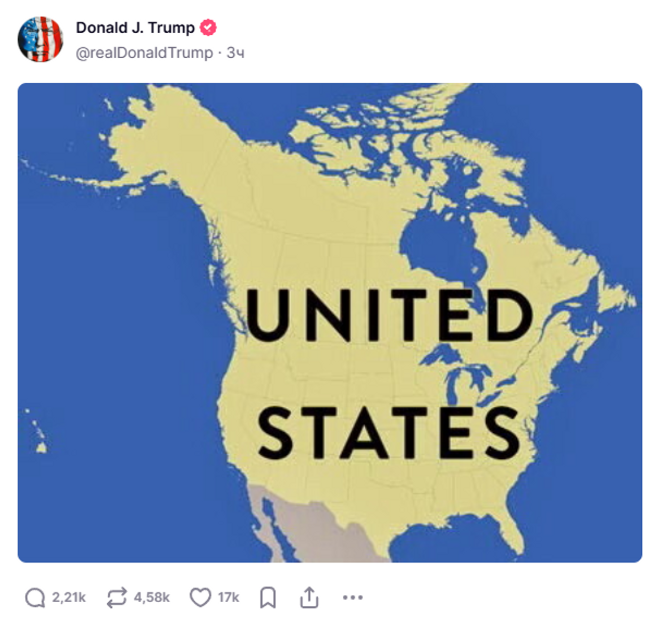 2 февраля, спустя сутки после введения 25-процентных тарифов на канадские товары, президент США Дональд Трамп призвал Канаду задуматься над тем, чтобы стать «любимым» 51-м американским штатом.