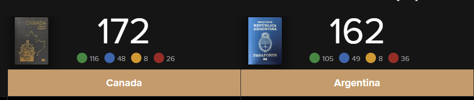 >>1181460 Кстати, сила паспортов этих двух стран не сильно то отличается лул, разве что в случае с аргентинским шитхолом придется делать визу в США и Канаду, а в остальном число безвизовых стран почти такое же.
