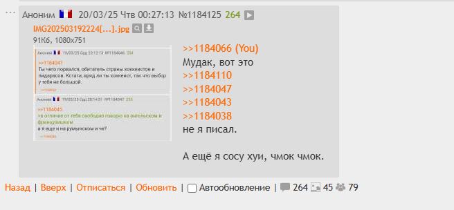 >Канадцы это североамериканские хохлы лол, не завидую будущему Канадки и неизбежному СВО со стороны Донни. СВО от Донни это плохо? Да скорей бы уже. Алсо последними над тобой посмеёмся мы, когда Дони выдаст коконадцам упрощённый ПМЖ в СШП, а ты так и будешь сычевать в Раисе с мамкой.