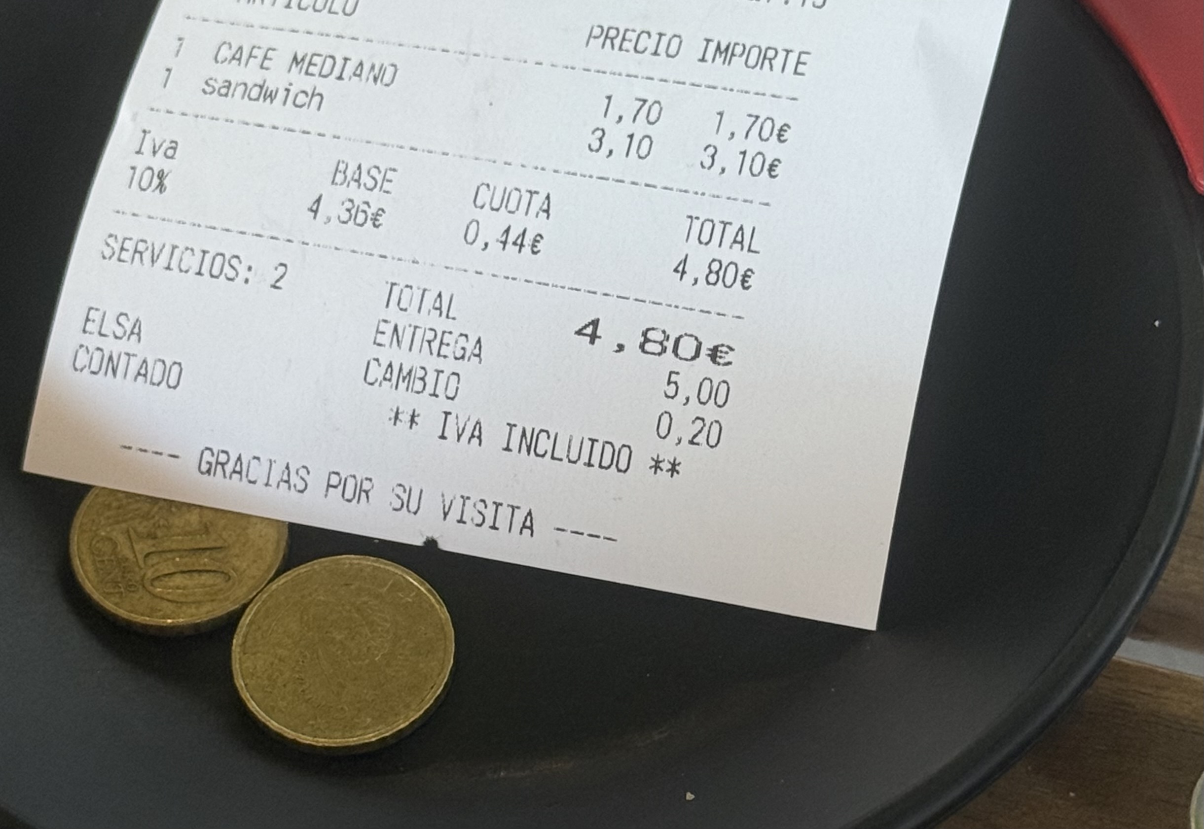 >>1183714 Нет дружочек. Я бредить не начал. В хиспании бутерброд с кофе или тортилья с кофе стоит 12 евро МИНИМУМ в заведении с интерьером уровня чебуречной. То что на картинке вышло бы евро в 25-30.