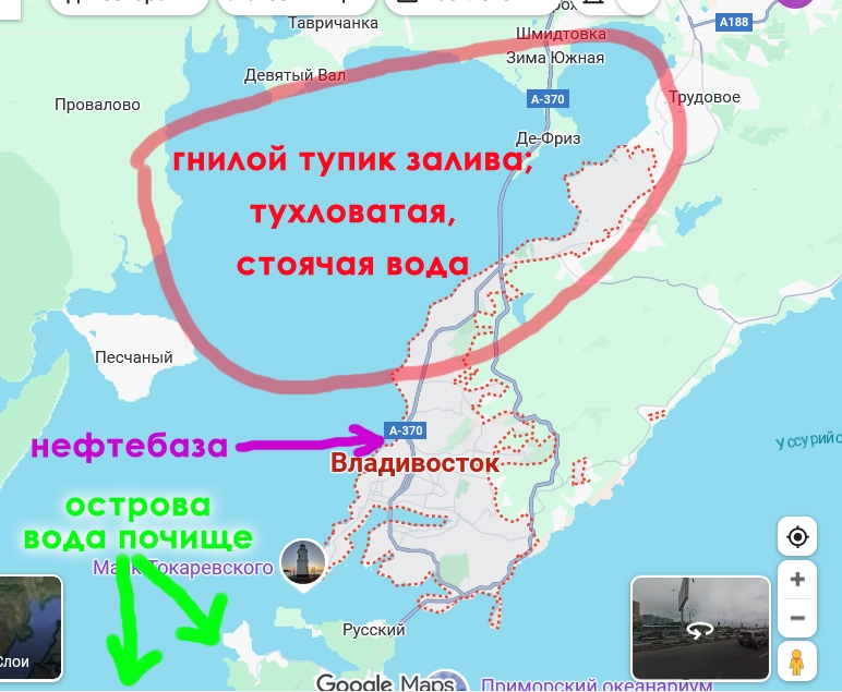 Заря, Седанка, Санаторная - за таки работающей нефтебазой, в красной зоне. Говно из новостроек всё течет куда? правильно, в воду, в непроточную кутовую часть Амурского залива.