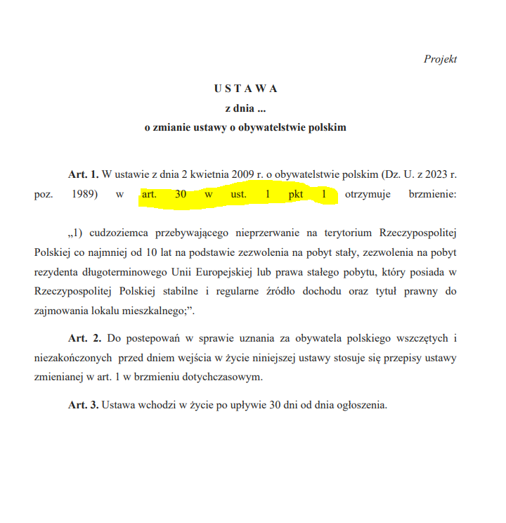 > Szef klubu PiS Mariusz Błaszczak poinformował w poniedziałek, że Prawo i Sprawiedliwość złożyło w Sejmie projekt zmiany w ustawie o obywatelstwie polskim. Projekt zakłada wydłużenie czasu potrzebnego cudzoziemcom na otrzymanie obywatelstwa do co najmniej 10 lat.