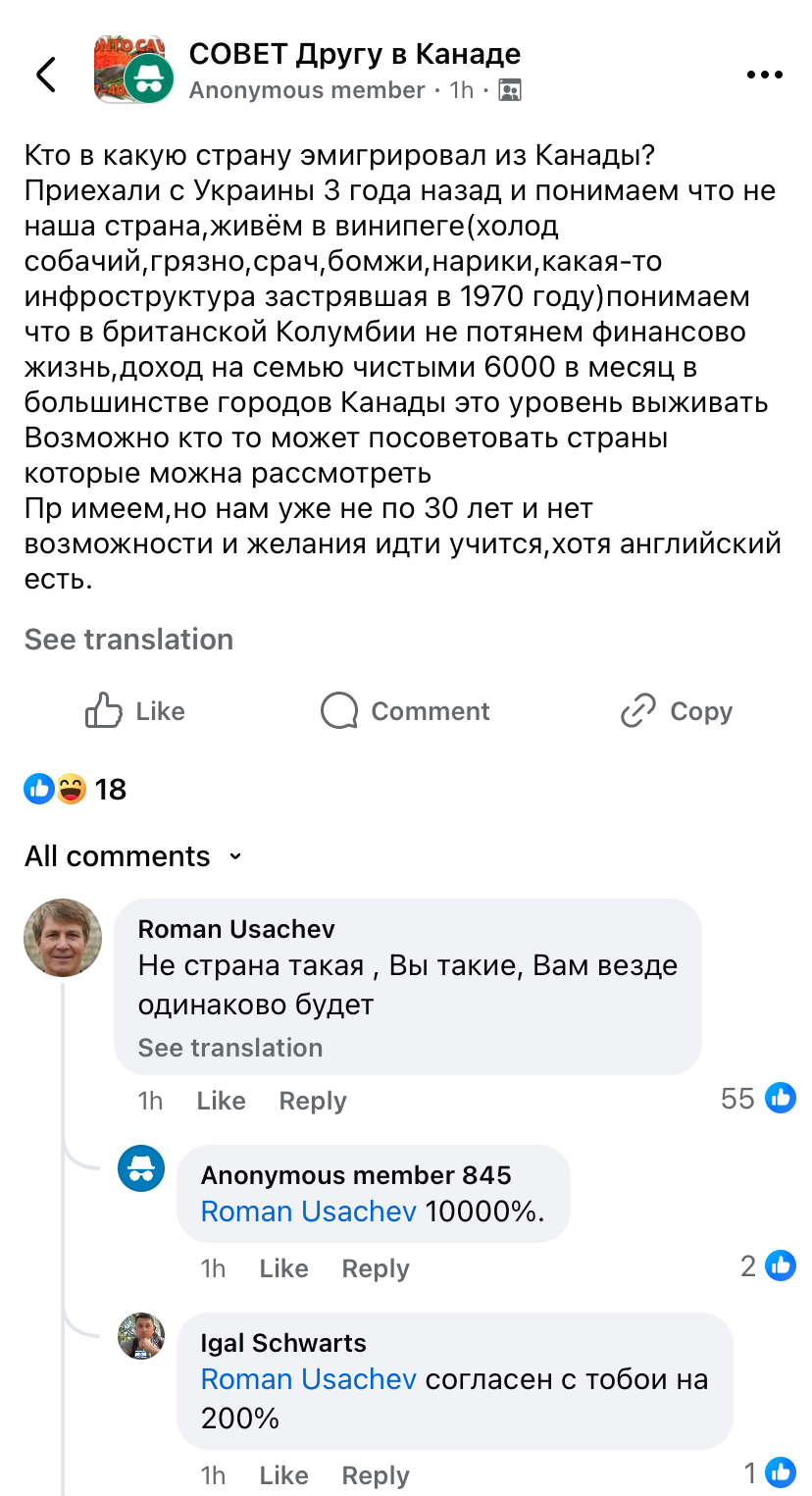 >Никакой навигации и такси, никаких доставок с костки и амзона. Нафиг не нужны были. Такси были, куча людей таксистами и работало. Костко появился в середине 80-х и быстро распространился, так что не пизди. Амазон не особо нужен. Все бумеры, которые переехали в Канаду в 80-е, прекрасно обжились. Даже те, кто переехал в 2000-е прекрасно обжились. А вот те, кто переехал после середины 2010х, ближе к 2020м, те сосут бибу. Разве что на норм работу устроились до кризиса, в отличие от многих украинцев. Но тут ещё фактор знания языка.