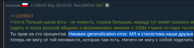 >>1209007 >Что в Польше шизы есть - не новость, страна большая, народу тут живёт разного много. Но это блядь как будучи таджиком сидеть в чатах русской общины и формировать мнение о 150М стране по паре тысяч шизов. Ты прав на сто процентов. Никаких generalization error. МЛ и статистика наши друзья. Но меня этот чат прям зацепил. Спать теперь не могу от той ненависти, которая там есть. Ничего не могу с собой поделать