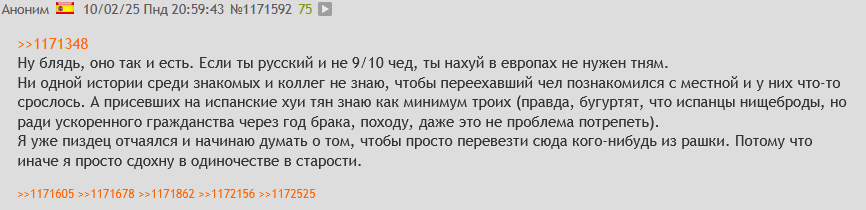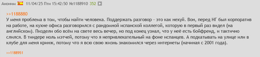 хотя и тян не лучше,много русских тян особенно после 25-30 это неликвид, обиженный и злой, вечно считающий и рассчиывюащий что-то на задворках общения, готовый обидеться и взорваться на что угодно. Все эти дискуссии о цветах и счетах, пересказы обид - это ведь вершина айсберга. А там в шкафу скелеты поосноватлеьнее. Попытки задеть, унизить, зашеймить, выпросить(подарки, еду, самокатные вкусняшки) - для меня это минус. Не потому что мне жалкобудь мне 23 и будь у меня первая или третья большая любовь, вместе с солидным зарабатокм, я бы естественно ухаживал вкусно и чтобы дофаминчик прямо в голову стрелял и воспоминния и эмоции на жизнь а потому что сам факт выпрашивания, жалоб, second thought сравнений тебя и других и абстаткных - это уже vibe killer. про "рука на пояс" и гримасу отчиытвания со слюнами навыкат как вебмки в пр про сидящих дома программистов, явные или неявные такие вот ситуации, и не говорю