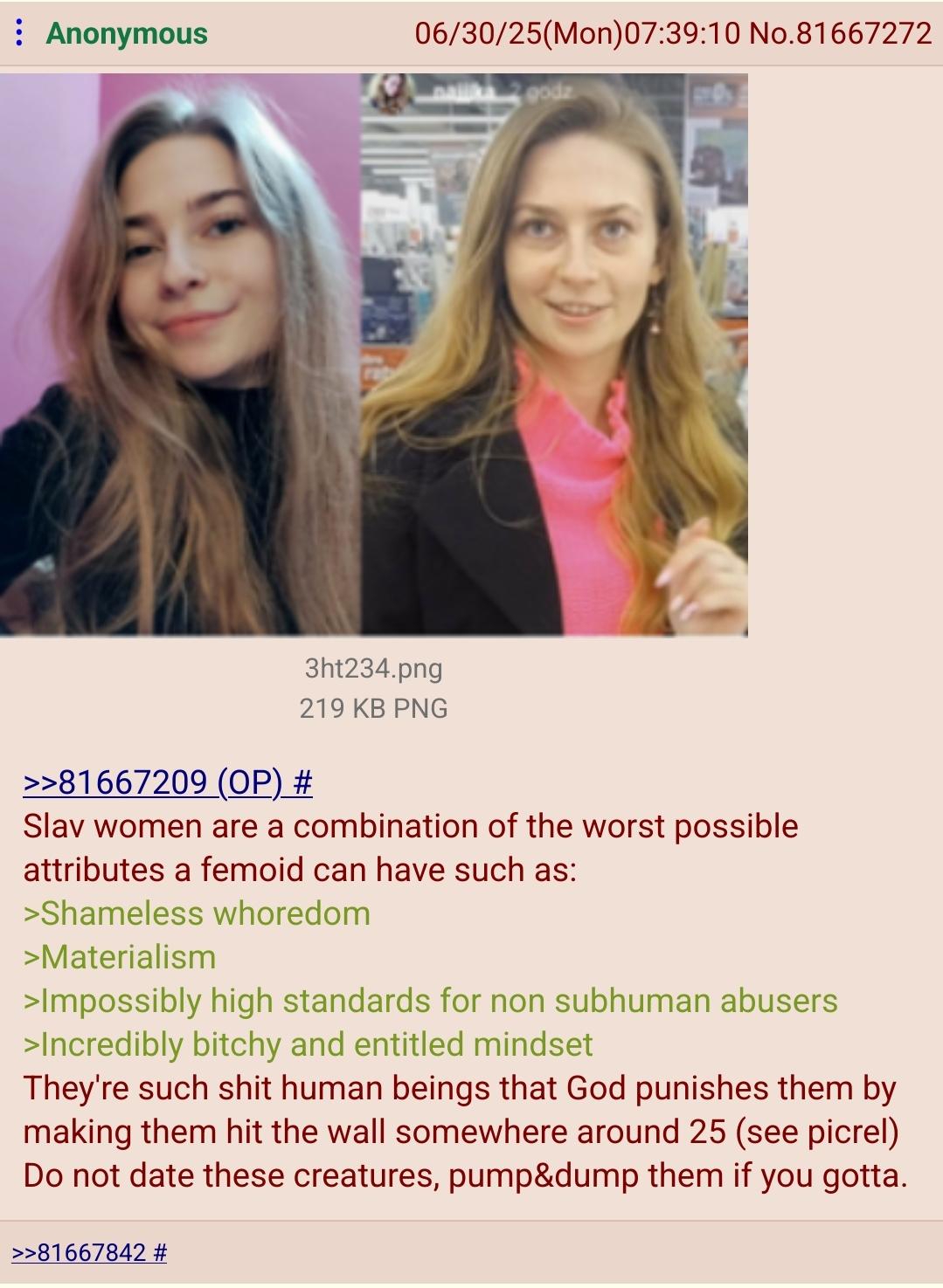 >>1224925 а ведь надо учитывать что в остальные 65% входят: - шлюхоходы - пиздаболы - геи - жирухоёбы - лютые бетабаксеры и тд >>1225542 дурдашмаксинг пробовал кто? >>1225262 но вообще мб эмигрантам в нормальные страны с этим как ни иронично проще. джессику мб проще набрутфорсить чем мариам. т.к. первая не живёт в среде где час секса стоит как месяц работы, значит не такая охуевшая. мб даже менее охуевшая чем наташи.