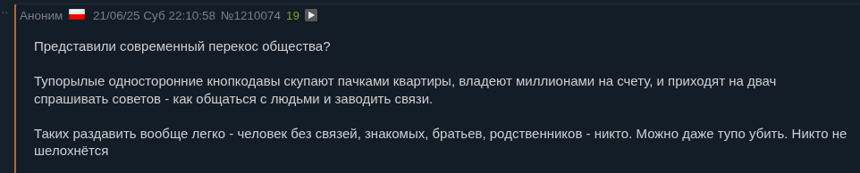 Тупорылые односторонние кнопкодавы скупают пачками квартиры, владеют миллионами на счету, и приходят на двач спрашивать советов - как общаться с людьми и заводить связи.