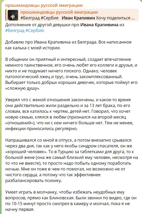 Я ещё заметила, что русы не только из-за общества в базированных парашах замыкаются в себе, они ещё и боятся, что их и за бугром российские спецслужбы достанут и добьются ареста или депортации. Даже в Сербии влияние русской гэбни велико, а уж в постсоветском мирке и подавно. Ну то есть, если в страну в принципу пускают русов, то она подпидорашенная по определению. Исключение — всякие далёкие нейтральные страны типа Японии, Таиланда, ОАЭ, но туда съёбывают совсем уж немногие.