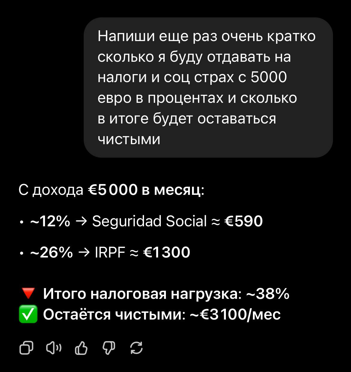 Что по налогам? Обязательно пользуйся услугами хестора - это не дорого. А сам обязательно обосрешься. Налоговый калькулятор для autonomo https://autonomoinfo.com/en/ Налог считается с чистой прибыли, в расходы можно списывать очень много чего - частично аренда и коммуналка, техника, расходы по работе, расходы на детей и т.д. Можно оформить режим Бэкхема - 24% с дохода. Думай как следует, нужно ли.