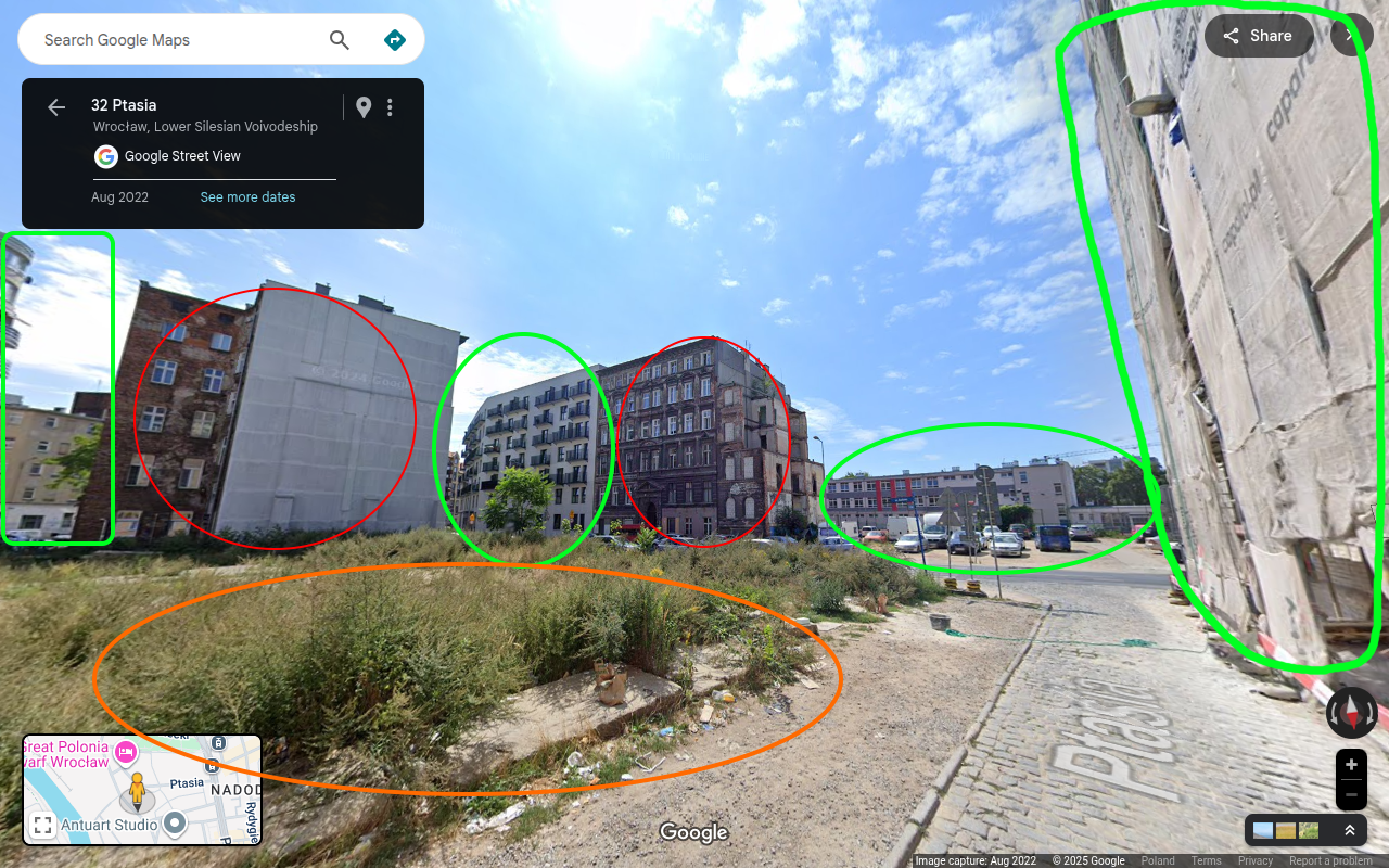 И давай рассмотрим твой пример подробно. >1230756 >Первый пик Даже здесь есть только одно, может быть, два проблемных места, выделенных красным. Большая часть находится в хорошем состоянии, выделена зелёным, одно здание активно ремонтируется в пику. А оранжевый — это просто пустой участок, ожидающий нового здания. А это ваш Норильск, а? >>1230882