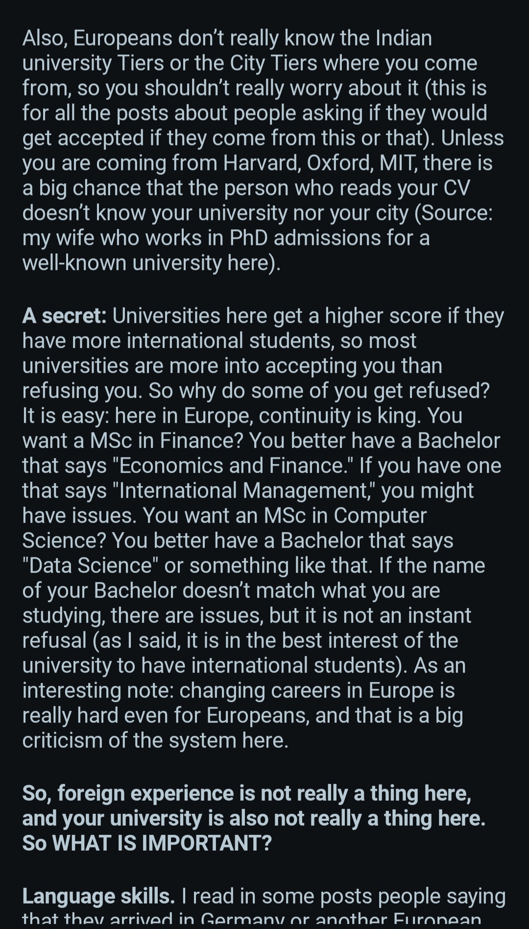 >>1223510 >>1223513 Я бы на твоем месте смотрел бы безотносительно страны, а по уровню вузов и стоимости обучения в них. На одном английском не уедешь. Здесь и местных полно с С2 инглишем. Тем более сейчас, на волне кризиса, очевидно, что рабочих мест становится меньше. Так что если ты не выдрочишь язык до В2 (что маловероятно с нуля за ¬2 года мастера, ибо ты будешь занят учебой, подработкой и т.п., до В1 еще реально, но с ним тебя говночистом разве что возьмут). Так что сразу тебе скажу, что "вдруг" не получится закрепиться, это должна быть упорная целенаправленная работа с конкретным пониманием твоих следующих шагов. Сразу скажу, что в дальнейшем не разбираюсь совсем, но если ты не тупой, то подумай об англоязычных странах. Да, там дорогая учеба и меньше льгот, но если ты выиграешь студенческий грант или стипендию, то это покроет расходы. Зато тебе не придется пердолиться с языком, да и вуз соответствующий, думаю, ценится не меньше какого-нибудь дерьманского. Как следствие, проще и остаться будет.