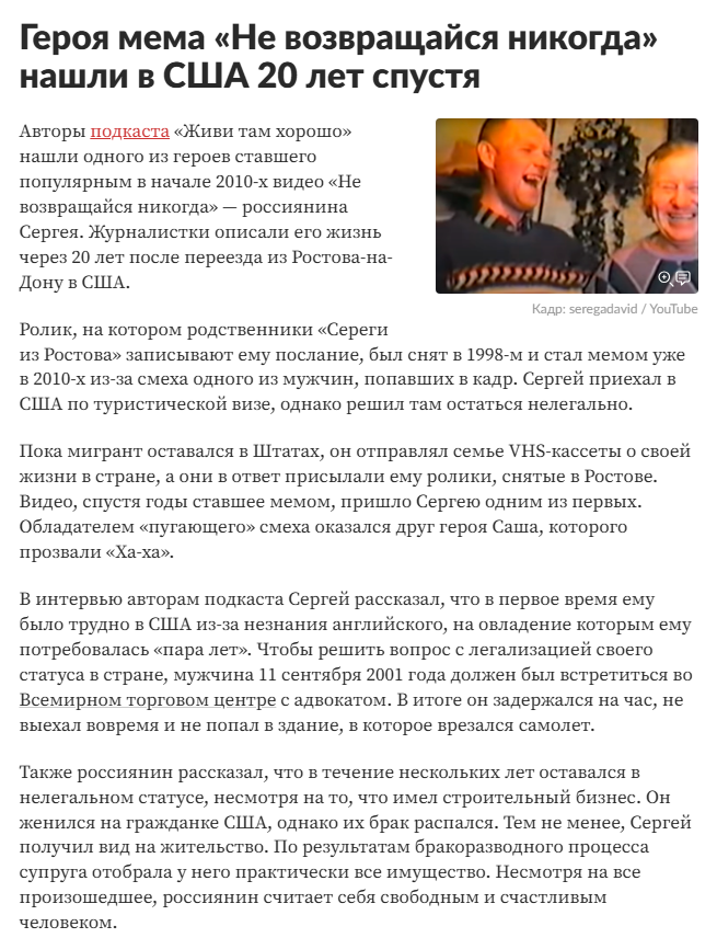 >>1222599 Я себе таких целей, в отличии от местных лебронов, никогда не ставил. Нахуя вообще в этой жизни кого-то переубеждать? Я лично знаю успешных перекатунов на 10к в западные гейропы. Ну вот лично я не такой. Большинство местной фауны тоже. Всяких неайтюков, я думаю, по понятным причинам, тоже всерьез рассматривать особо смысла нет. Ну я вот не строю себе мрий, как тот же намыв, например. Что вот щас куплю хату в рыгоне за 300к, буду на самолетиках летать и тогда ЖИЗНЬ НАЧНЕТСЯ. Я просто живу эту жизнь и делюсь тем опытом релокалции, что у меня есть. Хейтить кого-то при этом, ядом плеваться? Нахуй оно мине надо?