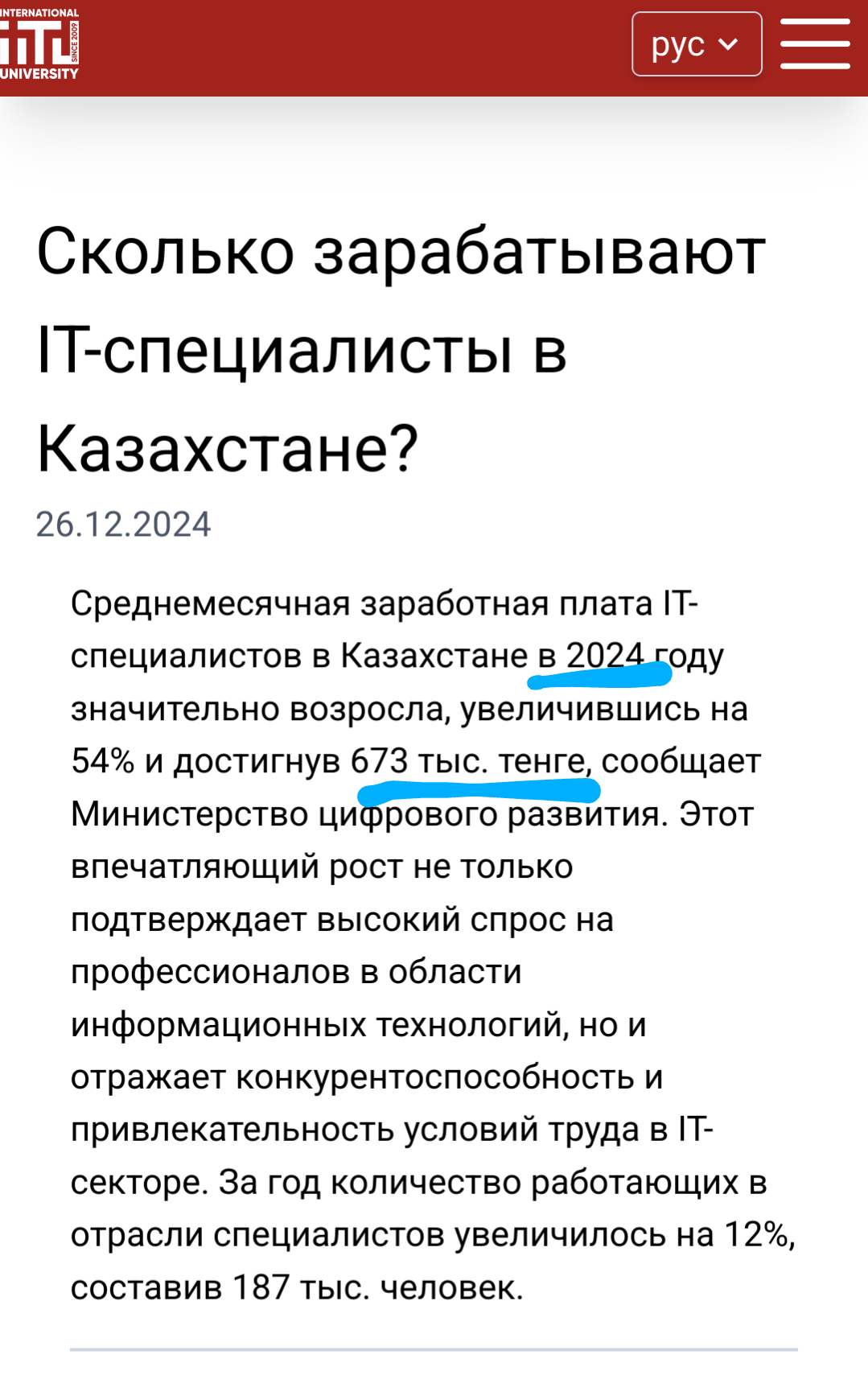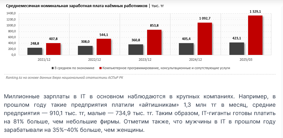>>1227740 А, блэт, я понял. Написано же чёрным по белому >Миллионные зарплаты в ІТ в основном наблюдаются в крупных компаниях. Например, в прошлом году такие предприятия платили «айтишникам» 1,3 млн тг в месяц, средние предприятия 910,1 тыс. тг, малые — 734,9 тыс. тг. Т.е. на картинке средняя на крупных предприятиях. Всё равно что взять среднюю в Сбертехе. Залупа.