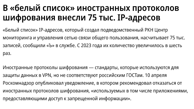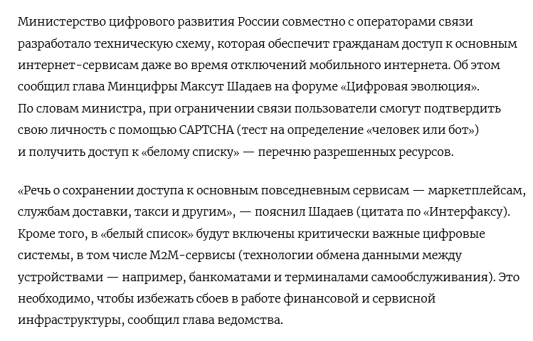"Глава Минцифры заявил о создании «белого списка» сервисов, которые будут работать при отключении мобильной сети. По словам Максута Шадаева, пользователи из России в условиях ограничения доступа к мобильной сети смогут воспользоваться сервисами массового использования, такими как маркетплейсы, службы доставки, такси. Минцифры и операторы связи уже подготовили техническую схему для реализации задумки, отметил чиновник. «То есть, когда происходит блокировка, по капче пользователи смогут получить доступ к белому списку массово востребованных сервисов на той же скорости», — сообщил он."