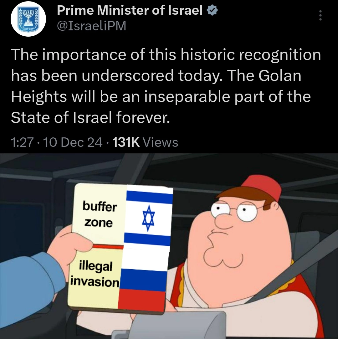 >>1228680 >их справедливая тактическая оборонительная аннексия По красоте разложил, теперь всё понятно! Хотя подожди, а что делать с этим? >Нетаньяху заявил, что Голанские высоты всегда будут неотделимой частью Израиля