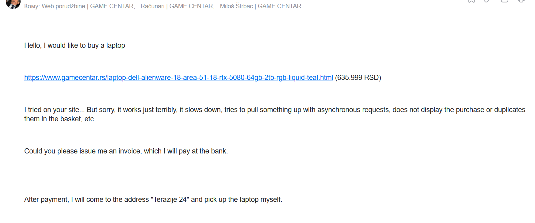 >>1228323 Да у них такое везде. Я когда ноут покупал жопой сгорел слегка от ублюдочного сайта gamecentar.rs В конце концов просто им на почту написал, чтобы мне инвойс выслали.