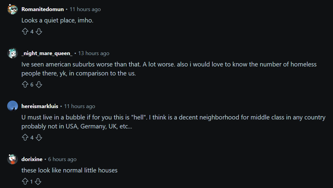 - "И где тут ад и ужасный урбанизм? Да, дорогие плохие, но в остальном очень даже уютно, уютнее чем ад из одинаковых картонных домов в моем Техасе"; - "Почему ты считаешь что это плохо? Лишь потому что это Россия?"; - "Честно, я бы предпочел это, чем американские субурбии"; - "Не так уж и плохо, 90% мира живёт ещё хуже! Выглядит как типичная субурбия в Алабаме"; - "Я бы предпочел жить там, с уютным забором, чтобы меня никто не видел, и нестриженной лужайкой, чем в американском ГУЛАГе, чтобы ехать 30км до ближайшего магазина на машине"; - "Ооо нет, в России нет машиноцентричности и одинаковых зомби-субурбий на сотни километров, Россия такая плохая!". - "УУУУ, Россия создаёт доступное жилье для своих же граждан в отличие от США, как же это плохо!!!" - "Ты, вероятно, очень хорошо живёшь, раз для тебя российские субурбии выглядят ужасно. Приезжай в Молдову, Латинскую Америку или Азию! Там гораздо хуже. А тут уровень среднего запада в США, может даже лучше чем у нас в США";