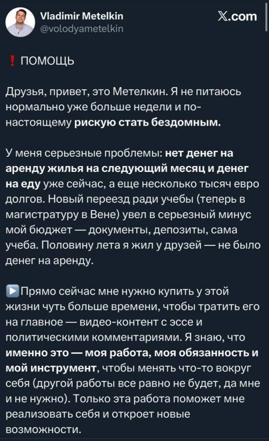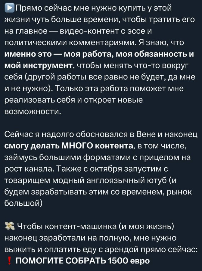 "У меня серьёзные проблемы : нет денег на еду и аренду жилья. Прямо сейчас мне нужно купить у этой жизни чуть больше времени, чтобы тратить его на главное — видео-контент с эссе и политические комментарии. Помогите собрать 1500 евро" https://t.me/boris_rozhin/180112