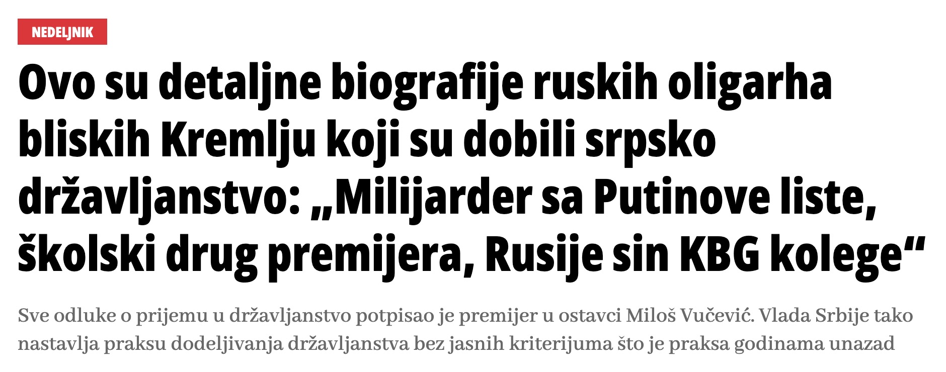 >>1238368 Им пасоши выдали просто так, даже без отказа от российских. Я подозреваю, что там тупо Пыня на стол Вучичу положил список тех, кому паспорта сербские надо выдать, в обмен на скидки на газ. И Вучич выдал паспорта людям, которые никак с Сербией не связаны и вероятно никогда в ней даже не были. Балканы, хуле.