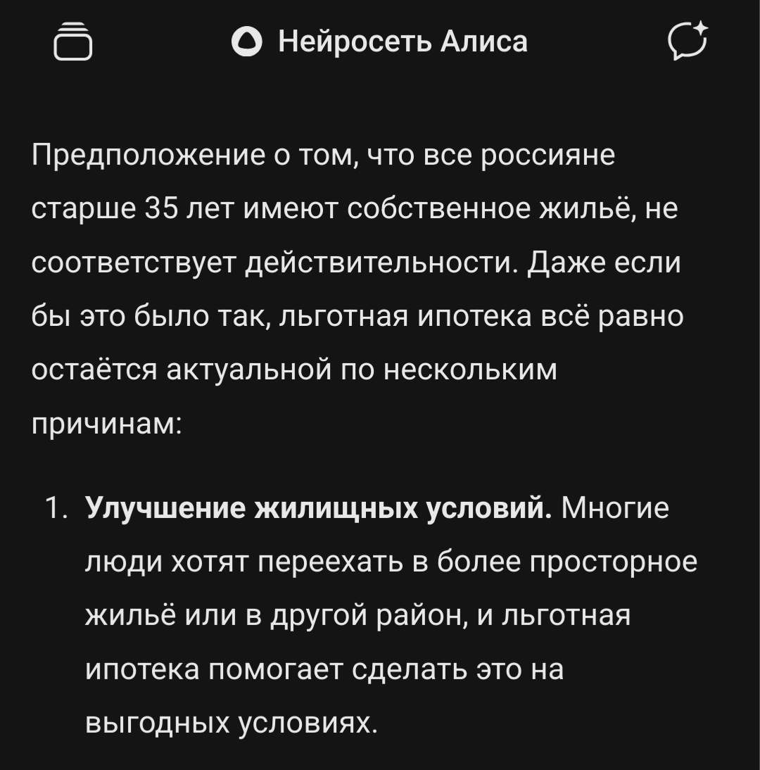 макаба проебала скрин >Нейросеть Алиса >Предположение о том, что все россияне старше 35 лет имеют собственное жильё, не соответствует действительности. Даже если бы это было так, льготная ипотека всё равно остаётся актуальной по нескольким причинам: >1. Улучшение жилищных условий. Многие люди хотят переехать в более просторное жильё или в другой район, и льготная ипотека помогает сделать это на выгодных условиях.