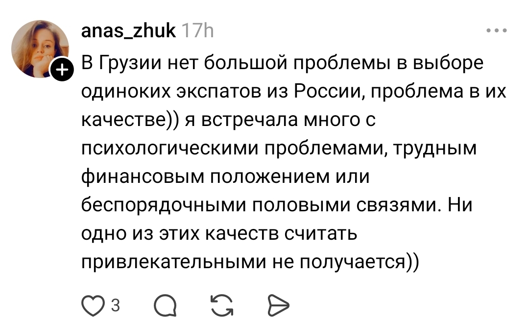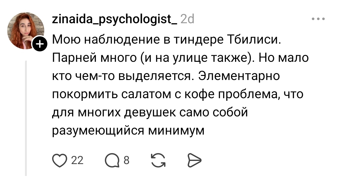 > А на самом деле все просто, у тебя проблемы с башкой, и тян их считывает уже по твоим фоткам и описанию в профиле. Женщины выходят всё на новый уровень телепатии. То они всё невербалку считывали, а тут уже оказывается по фото узнают. Странно что не на кофейной гуще.
